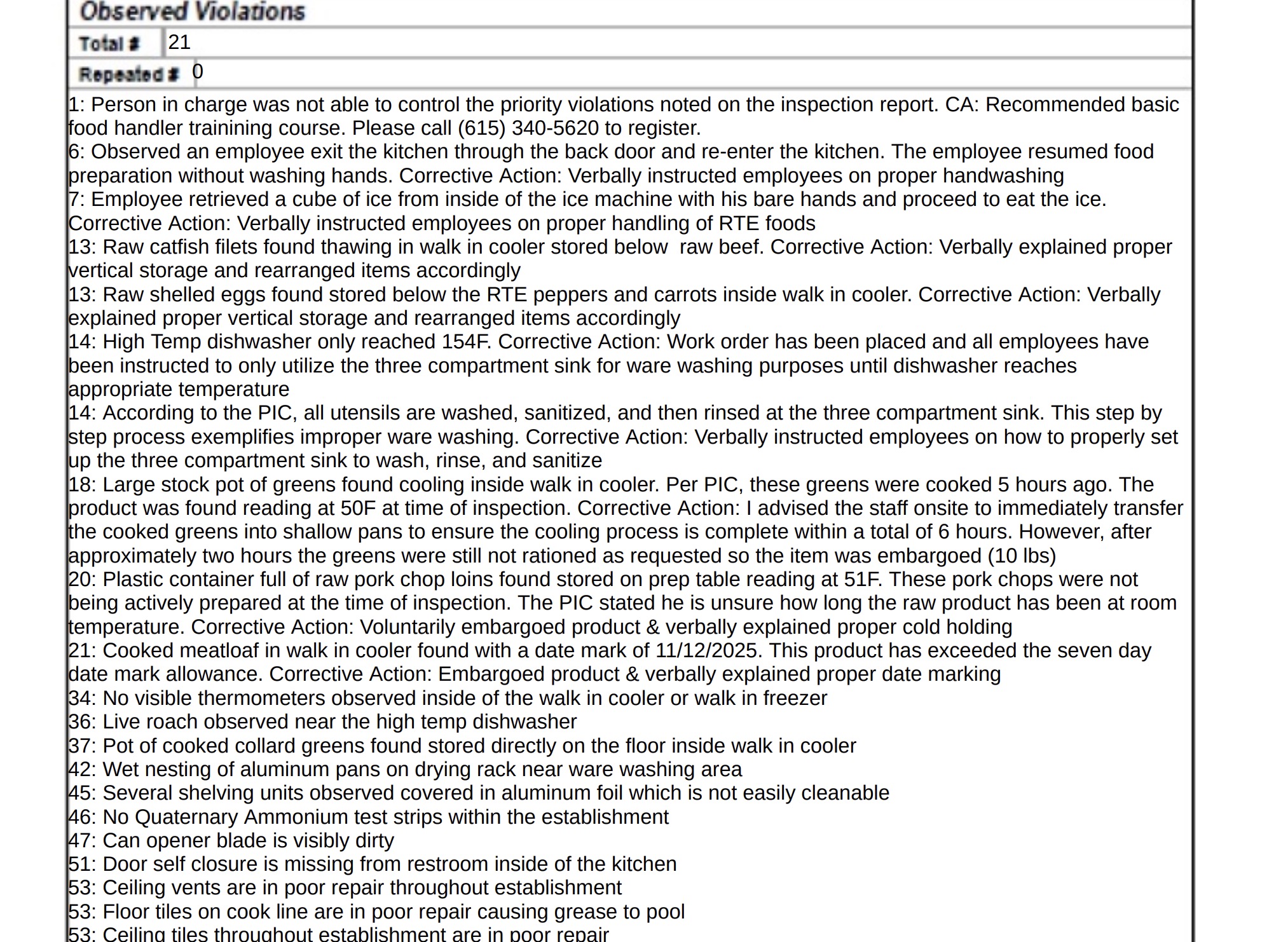 According to the health inspection report, Swett’s was cited for 21 violations. They are as follows: