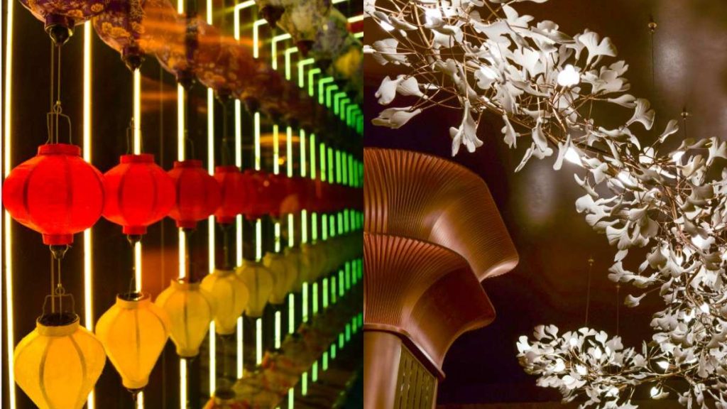 Glowing lanterns and Porcelain ginkgo leaf light fixture at the location (Credit: Baylie Bodiford)