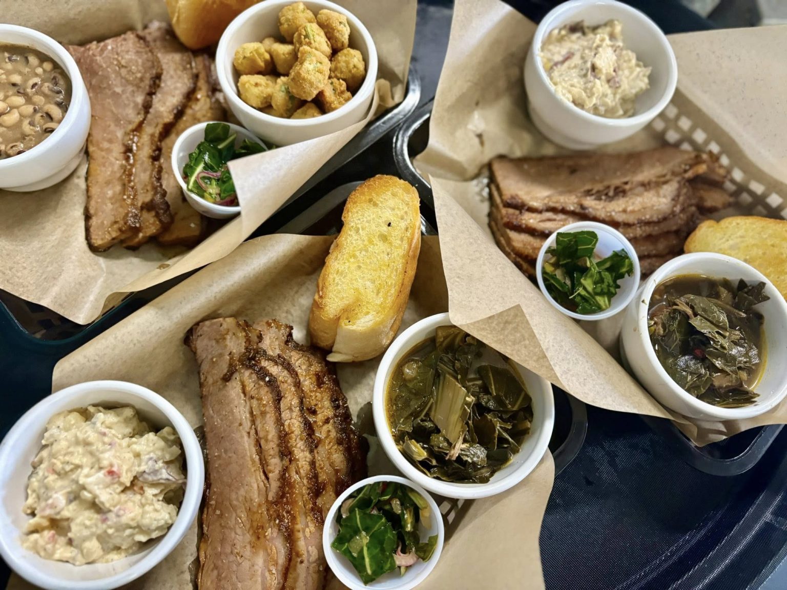 Boonies menus show the restaurant offers a wide range of barbecue classics, including smoked chicken wings, brisket, pork butt, turkey, ribs, and sausage links. Side dishes included potato salad, baked beans, fried okra, coleslaw, collard greens, and mac-and-cheese.