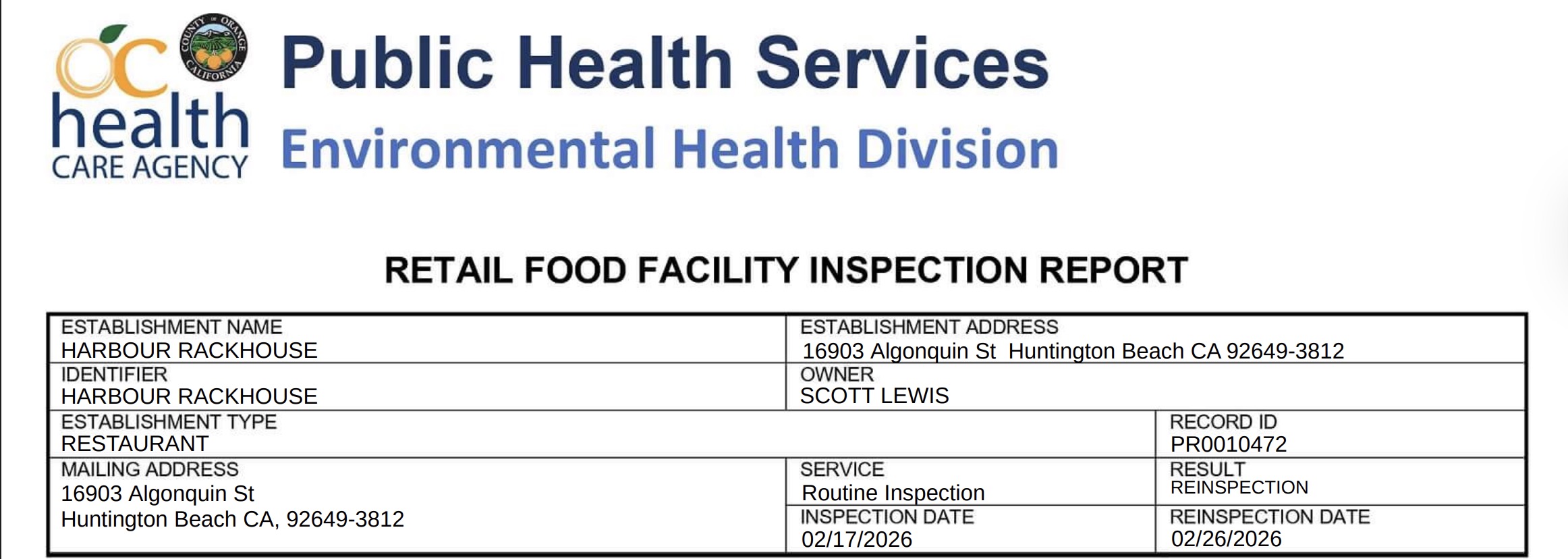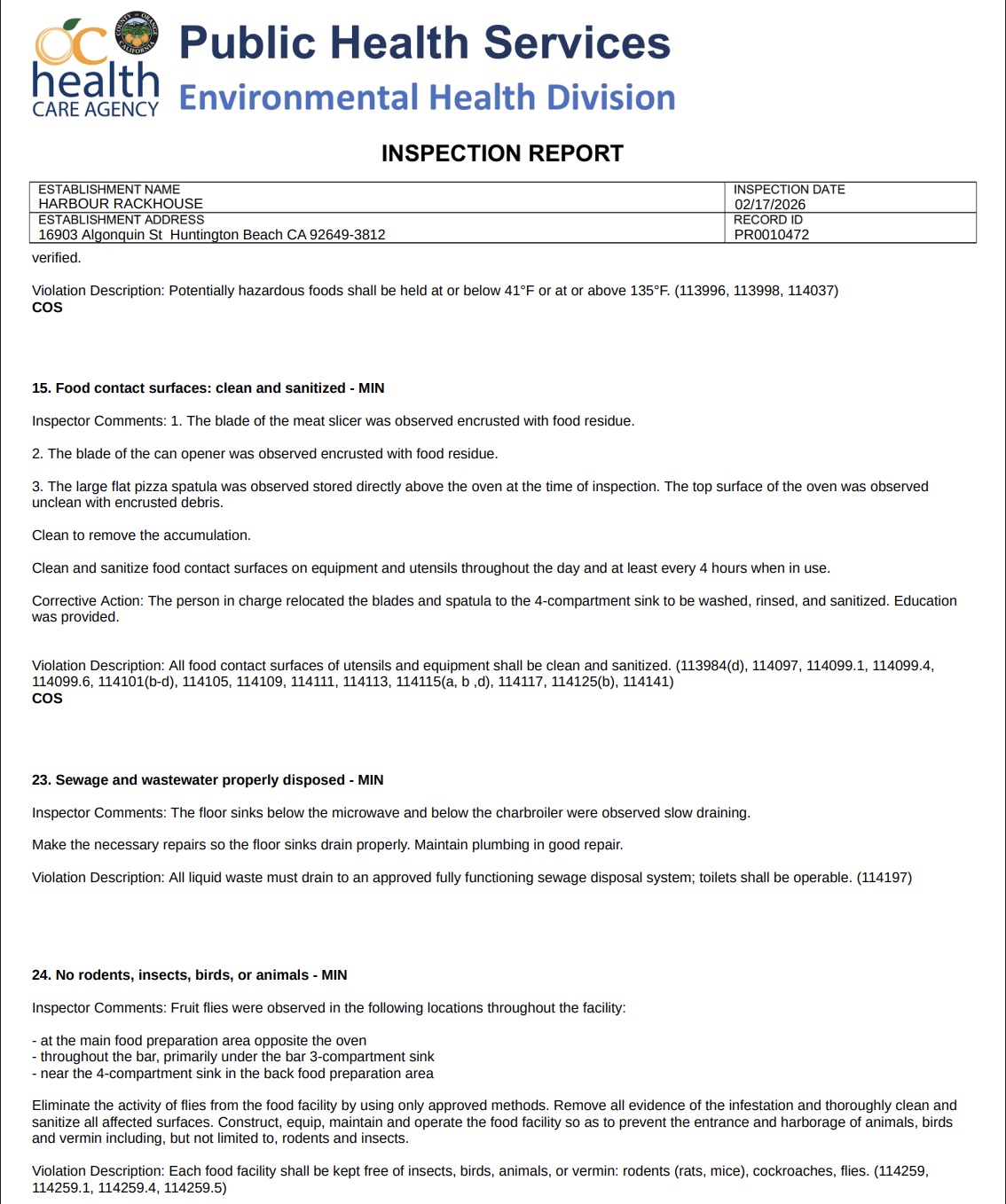 Screenshot of the report (Source: inspections.myhealthdepartment.com/orange-county)