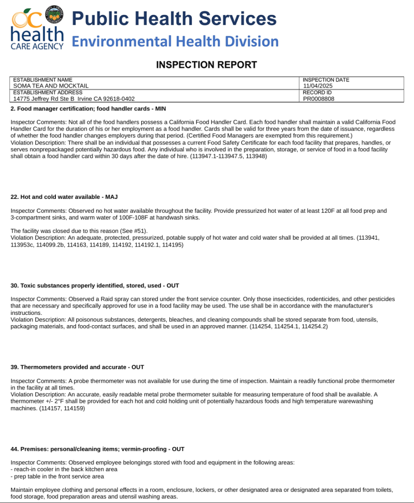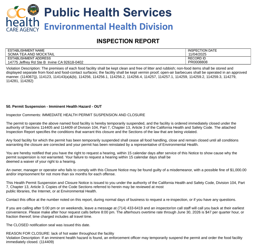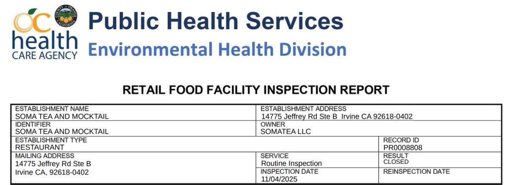 In one of its routine inspections on November 4, the Orange County Health Care Agency cited Soma Tea and Mocktail for health violations. The health inspectors shared further details in their report for the bubble tea establishment, including its temporary closure and follow-up inspection.