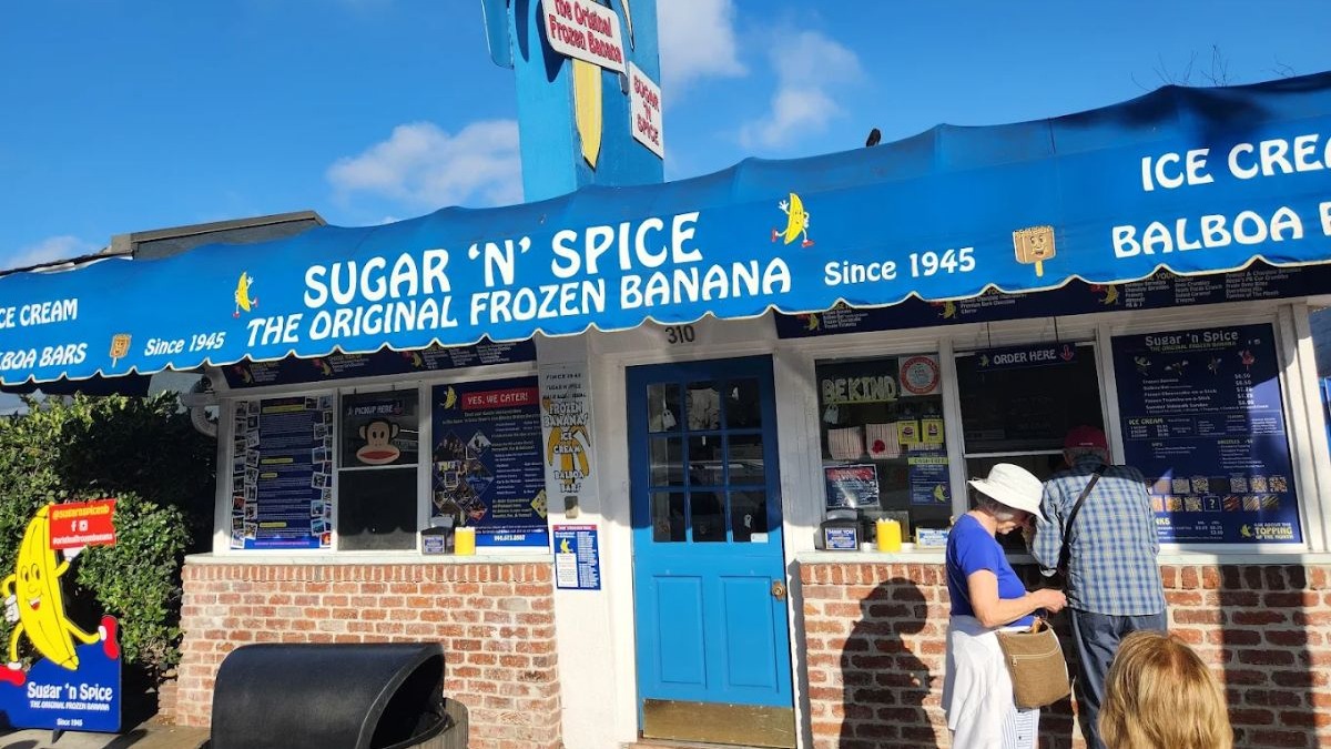 Sugar N Spice is a famous ice cream stand on Balboa Island since 1945, known for its hand-dipped Balboa bars and frozen bananas. Customers can choose from classic options such as Classic Chocolate, Dark Chocolate, Butterscotch, and Cherry Dip. For 80 years, people have enjoyed these unique desserts, which were an accidental invention.