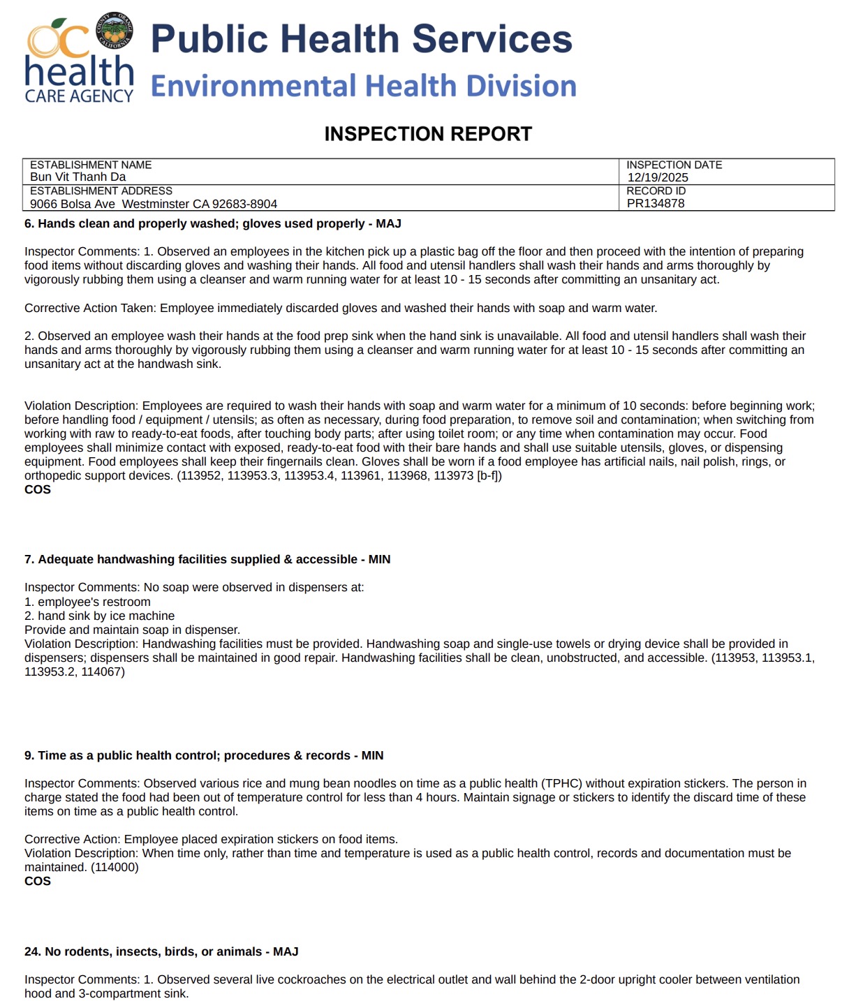 The Orange County Health Care Agency conducted routine food safety inspections across the area on December 19. Among them, Bun Vit Thanh Da was cited for multiple health code violations, including the accumulation of dust and grime and improper storage.