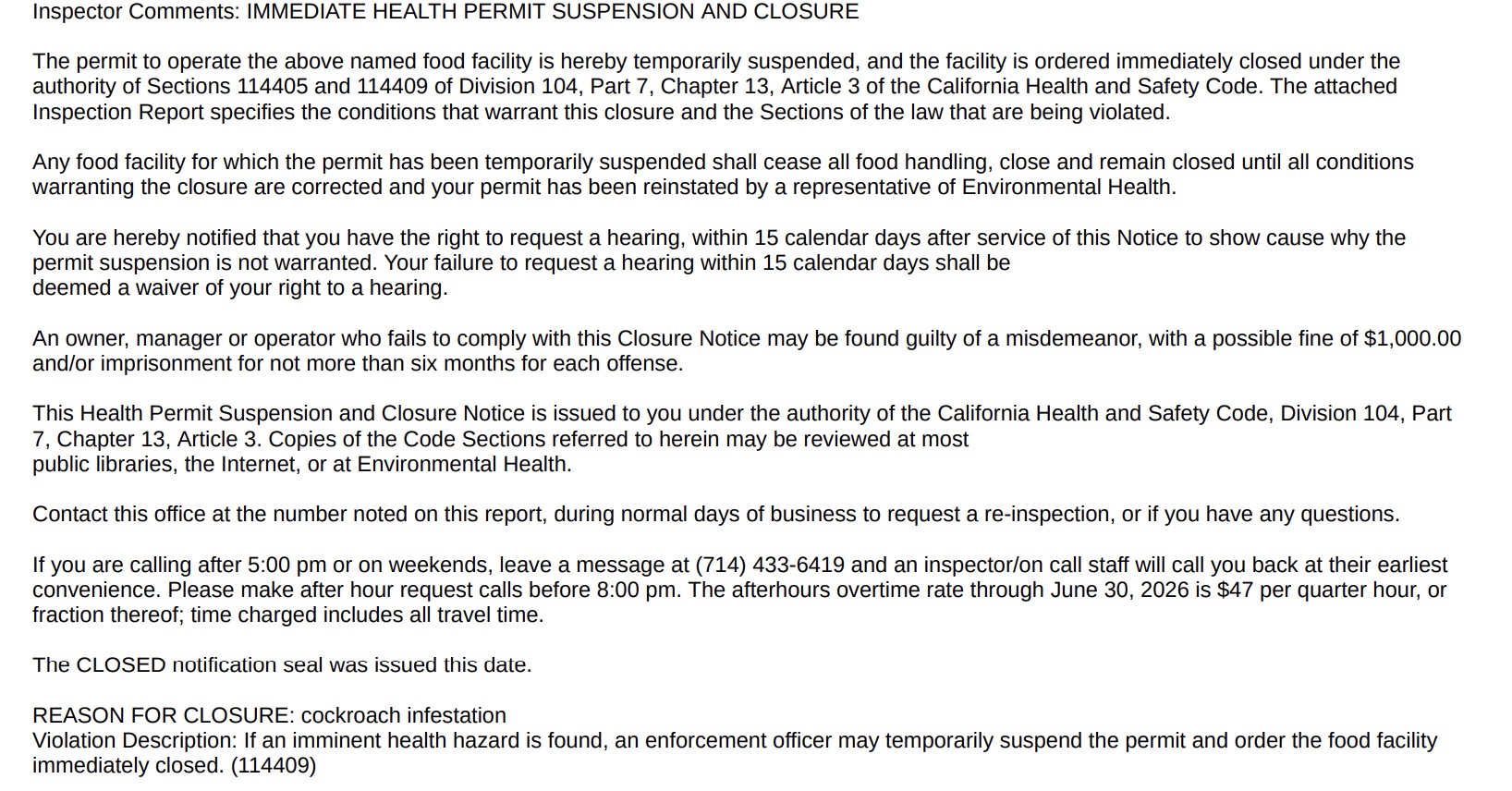 According to the comments in the report, Bun Vit Thanh Da had its health permit suspended and was ordered to close immediately. The eatery is expected to address all the cited issues, particularly the cockroach infestation, to lift the suspension. Once the violations are corrected, the restaurant may request a reinspection from the health department.