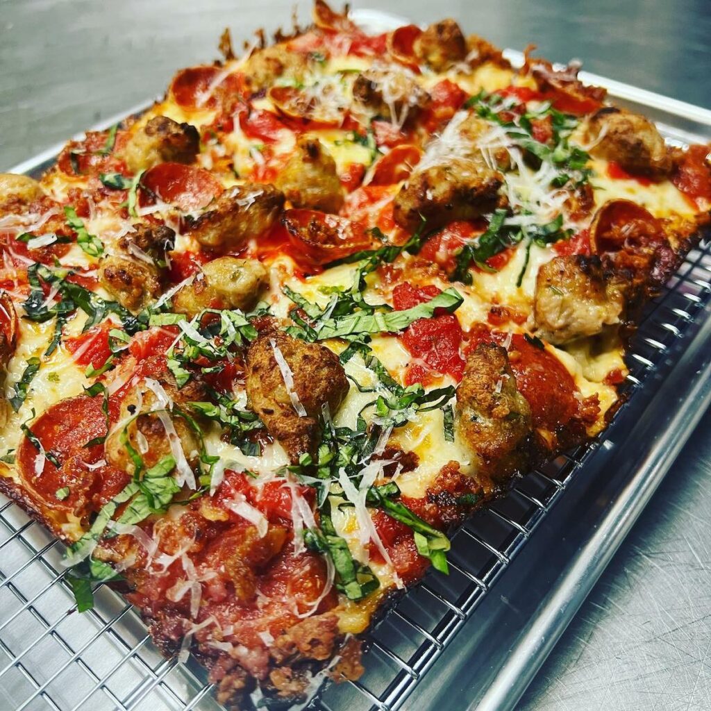 “We start by baking your DSP in traditional blue steel pans sourced directly from MI. which create the unique characteristics of this style pizza. Everything is made in house including Stanislaus tomato sauce, our proprietary brick cheese blend shredded in house and the star of the show, our high hydration authentic Detroit dough.”