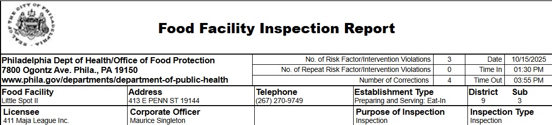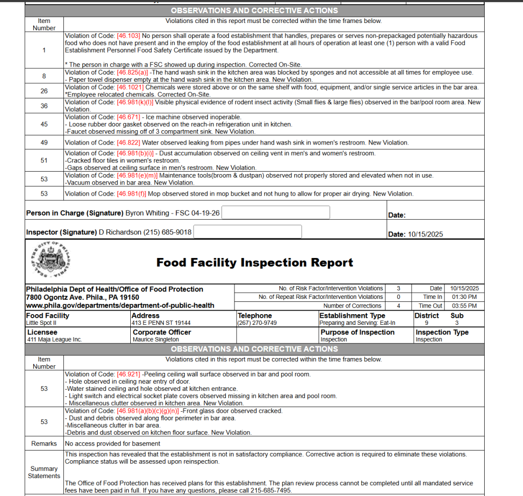 The Philadelphia Department of Health/Office of Food Protection recently conducted a routine health inspection at Little Spot II on October 15. According to the official report, the tavern was found to be in unsatisfactory compliance. The report mentioned: