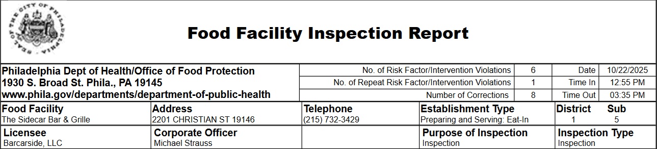 A health inspection by the Philadelphia Department of Public Health on October 22 found several violations at The Sidecar Bar & Grille, including sanitation issues in the second-floor bar area and improper food holding temperatures.
