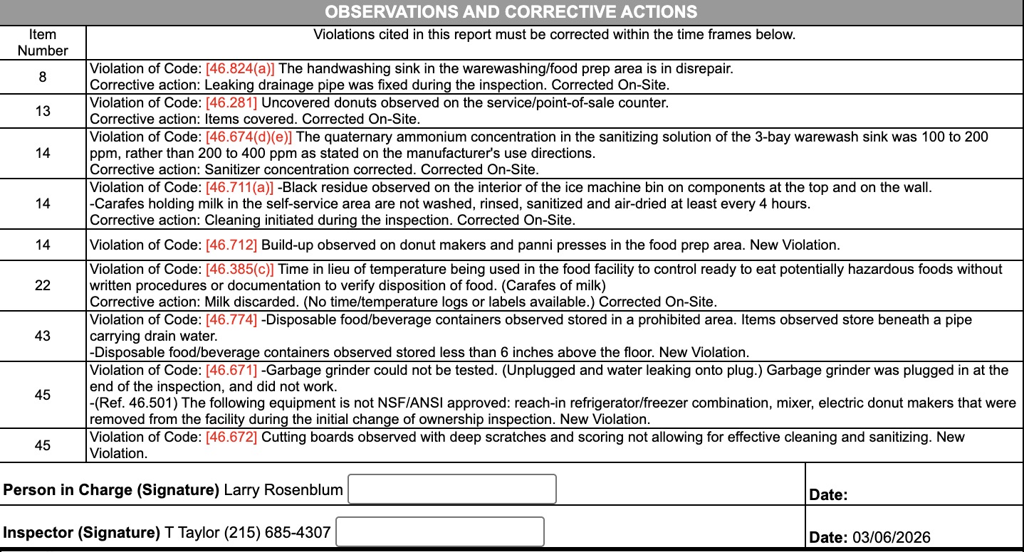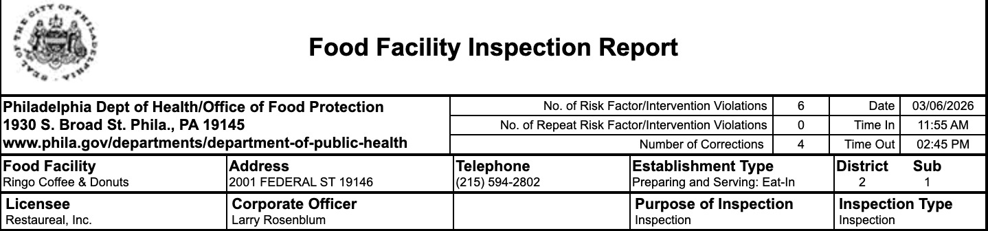Ringo Coffee & Donuts underwent a health inspection on March 6 by the Philadelphia health department. The health inspectors reported multiple violations, including equipment and storage concerns.