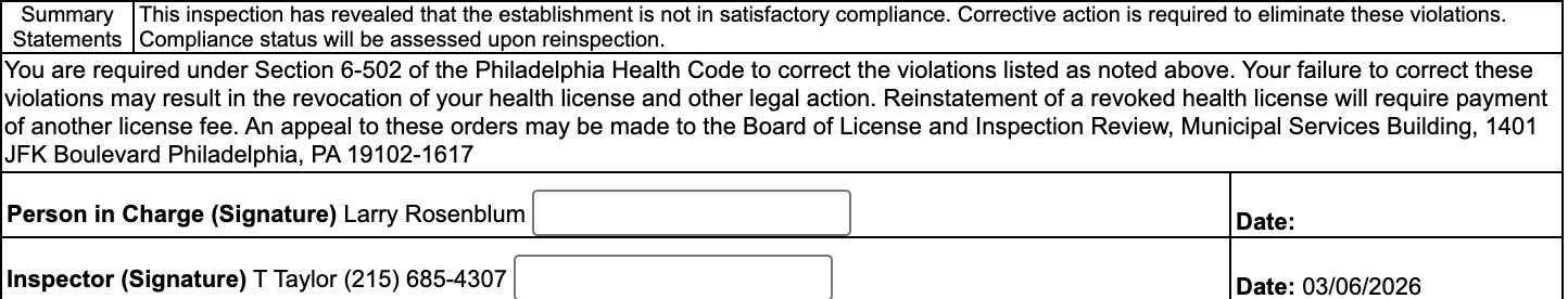 According to the report, the establishment was not in satisfactory compliance. It noted that corrective actions were to be taken ahead of the reinspection and that failure to do so could lead to revocation of the eatery’s health license and other legal actions.