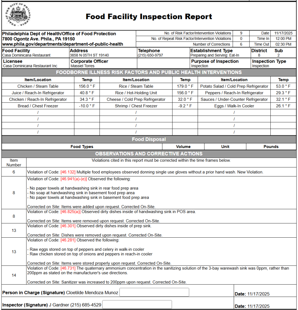 The Philadelphia Department of Health conducts routine inspections of restaurants in the area. On November 17, 2025, the department revealed several violations at Casa Dominicana Restaurant. A follow-up inspection will verify the correction of these violations.