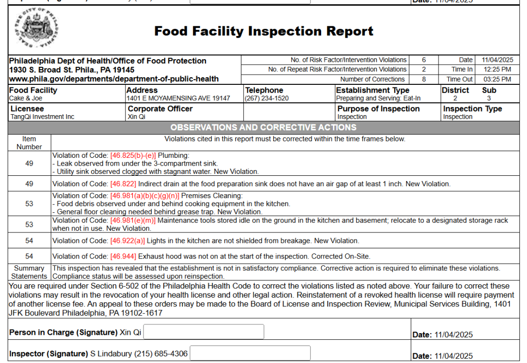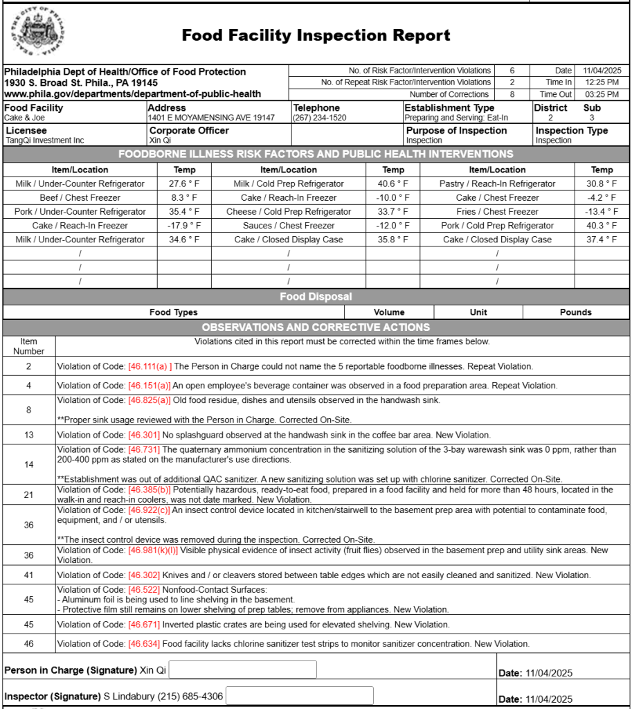 Cafe Cake & Joe underwent a health inspection by the Philadelphia Department of Health on November 4. The report revealed several violations, including unmarked ready-to-eat food, a clogged utility sink, and the absence of chlorine sanitizer test strips.