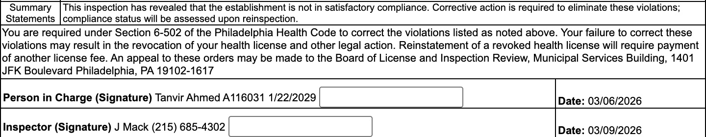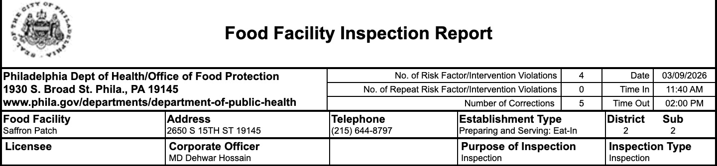 In an inspection conducted on March 9, the Philadelphia Department of Public Health reported violations at Saffron Patch. The inspection report cited equipment issues, sanitation concerns, and improper food storage.