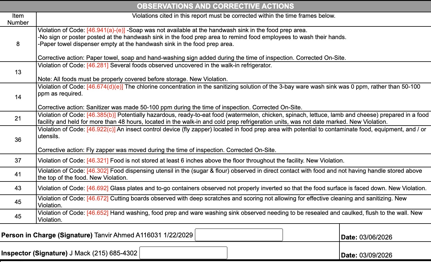 According to the report, the inspection revealed found that Saffron Patch was non-compliant with food regulations. The restaurant was asked to correct all the violations ahead of the reinspection, or it may face revocation of its health license and other legal action.