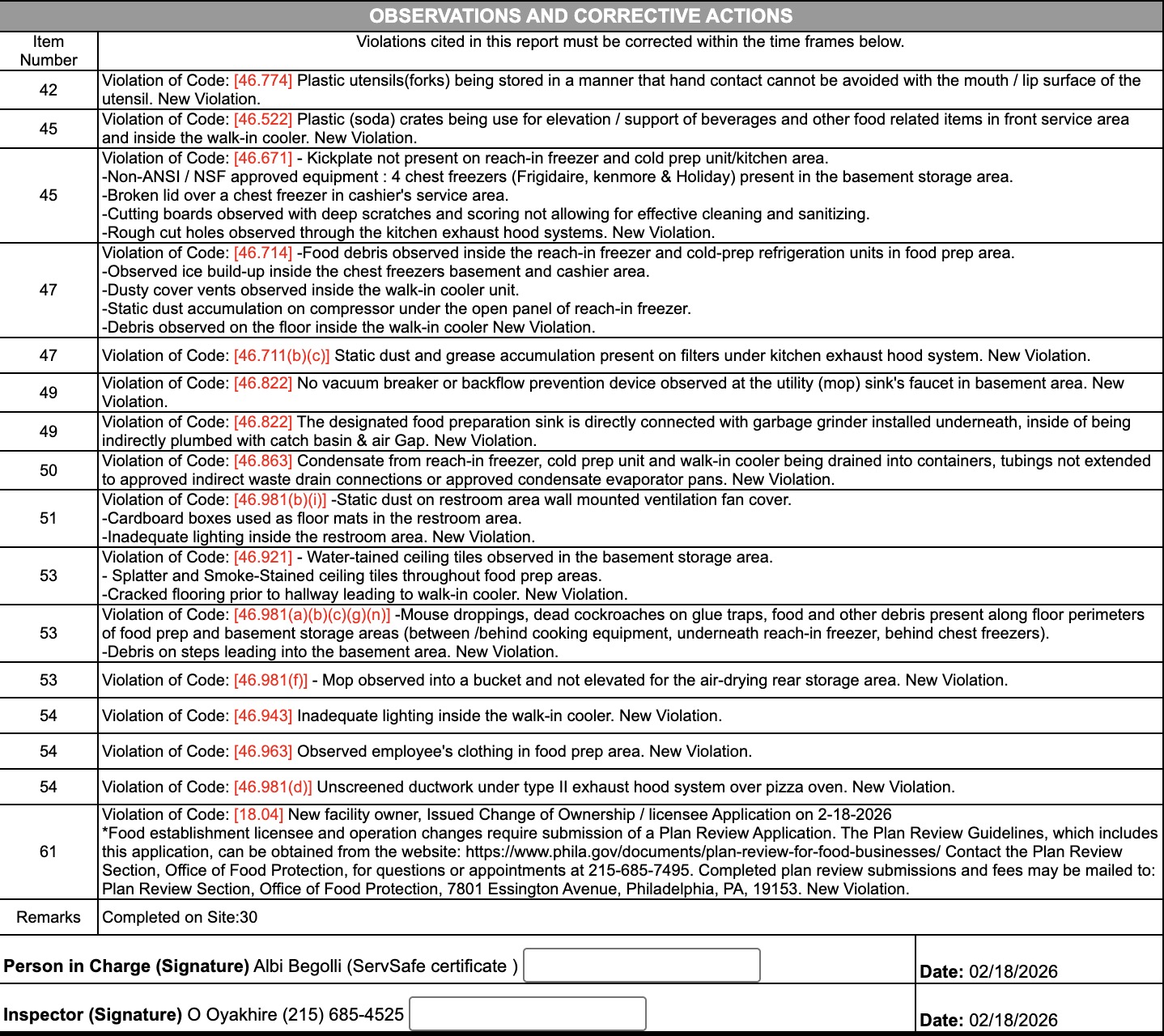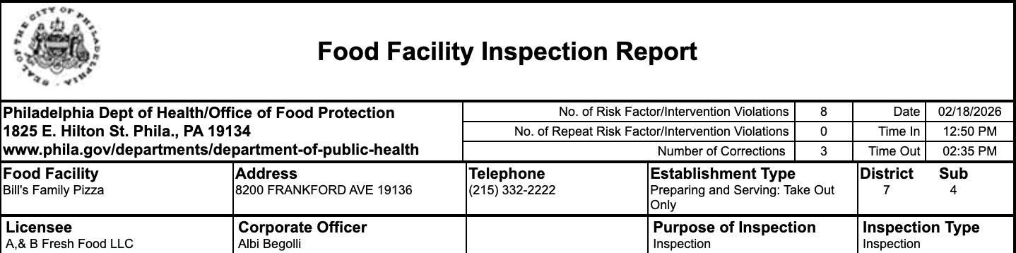 The Philadelphia health department carried out several routine checks on February 18 in the area. Bill’s Family Pizza was found in violation of several food safety codes and had no valid food license.
