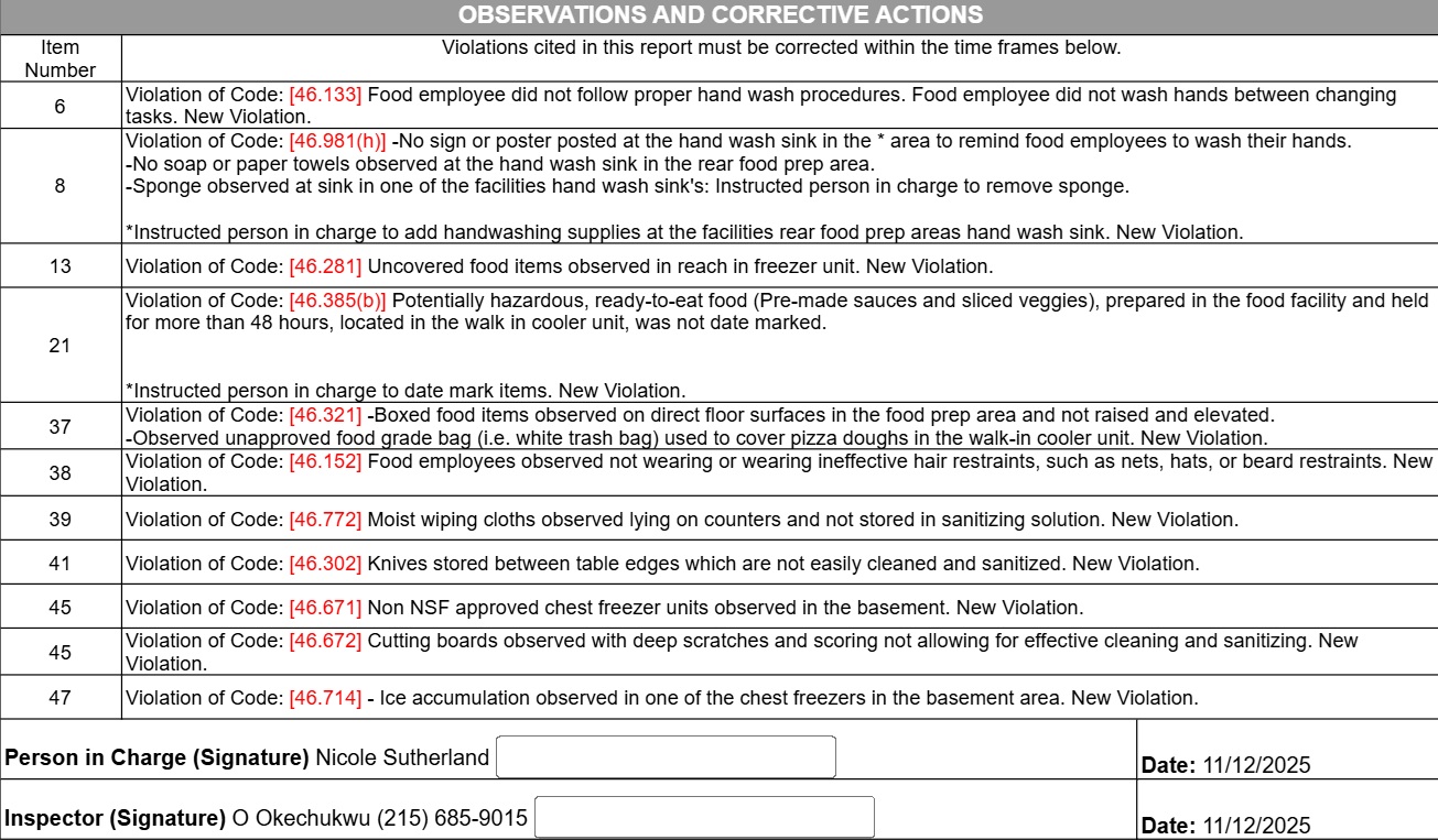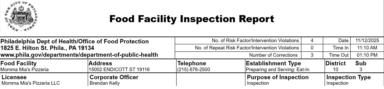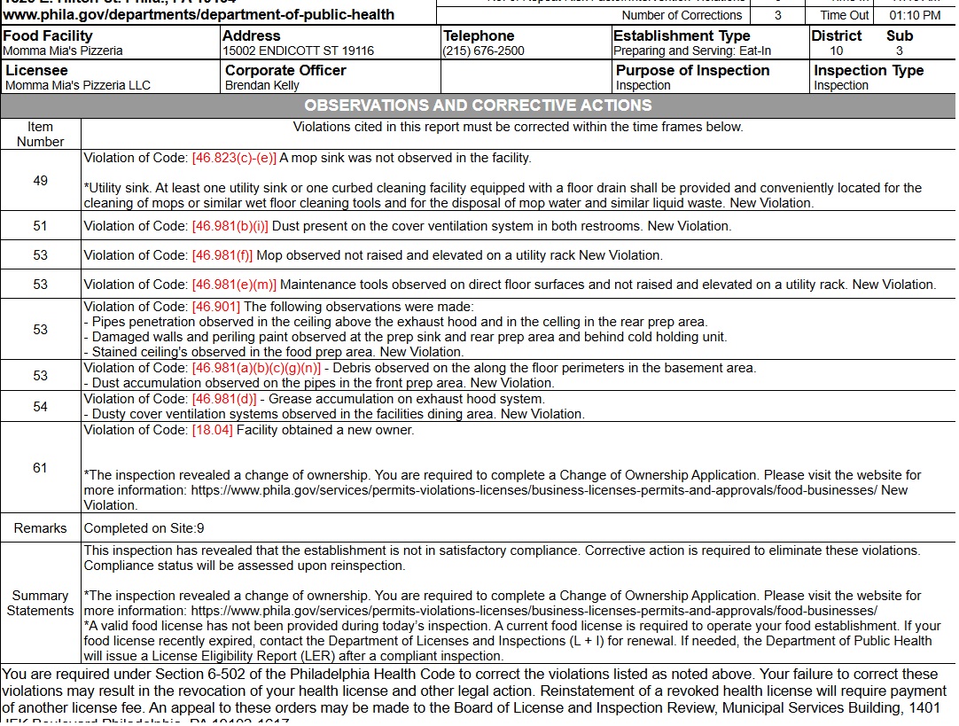 Momma Mia’s Pizzeria was inspected by the Philadelphia Department of Public Health. The report revealed several health code violations, including the improper storage of equipment and uncovered food items.