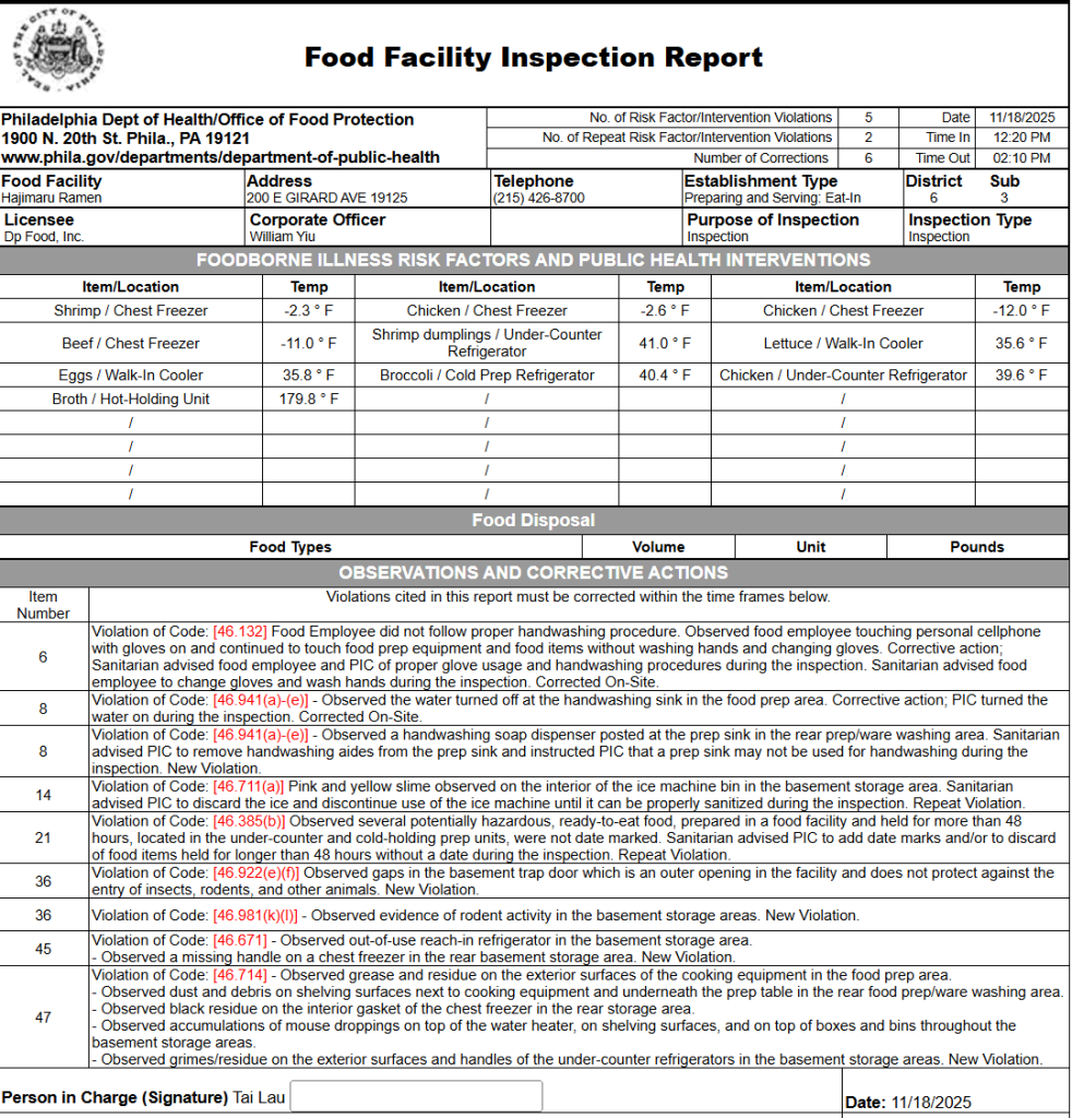 Hajimaru Ramen in Philadelphia was inspected by the health department on November 18. Multiple violations were found during the inspection. The restaurant is now expected to address all violations before reinspection.