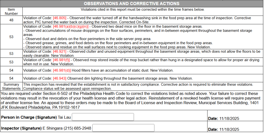 [Editor’s note: The report mentioned here is from an inspection conducted on November 18 and may not represent the future health inspection status of the food establishment.]