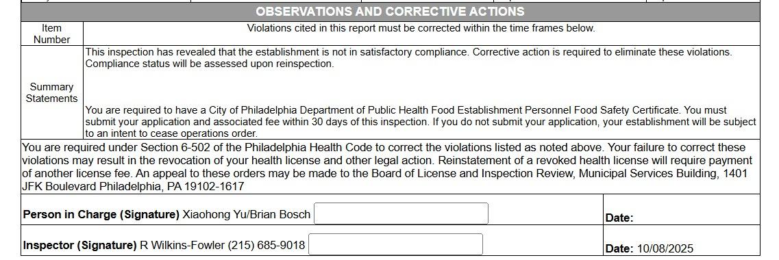 - During the inspection, the establishment failed to provide a Philadelphia Food Safety Certificate.