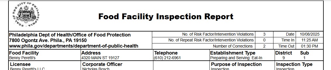 The Philadelphia Department of Health/Office of Food Protection conducted a routine inspection at Benny Peretti’s on October 8. Inspectors found health code violations at the Philadelphia restaurant. The restaurant must address all violations before requesting a reinspection.