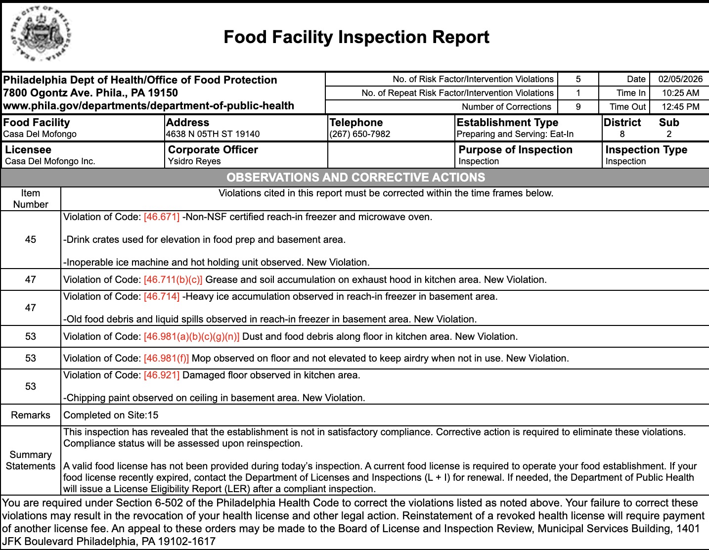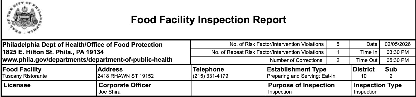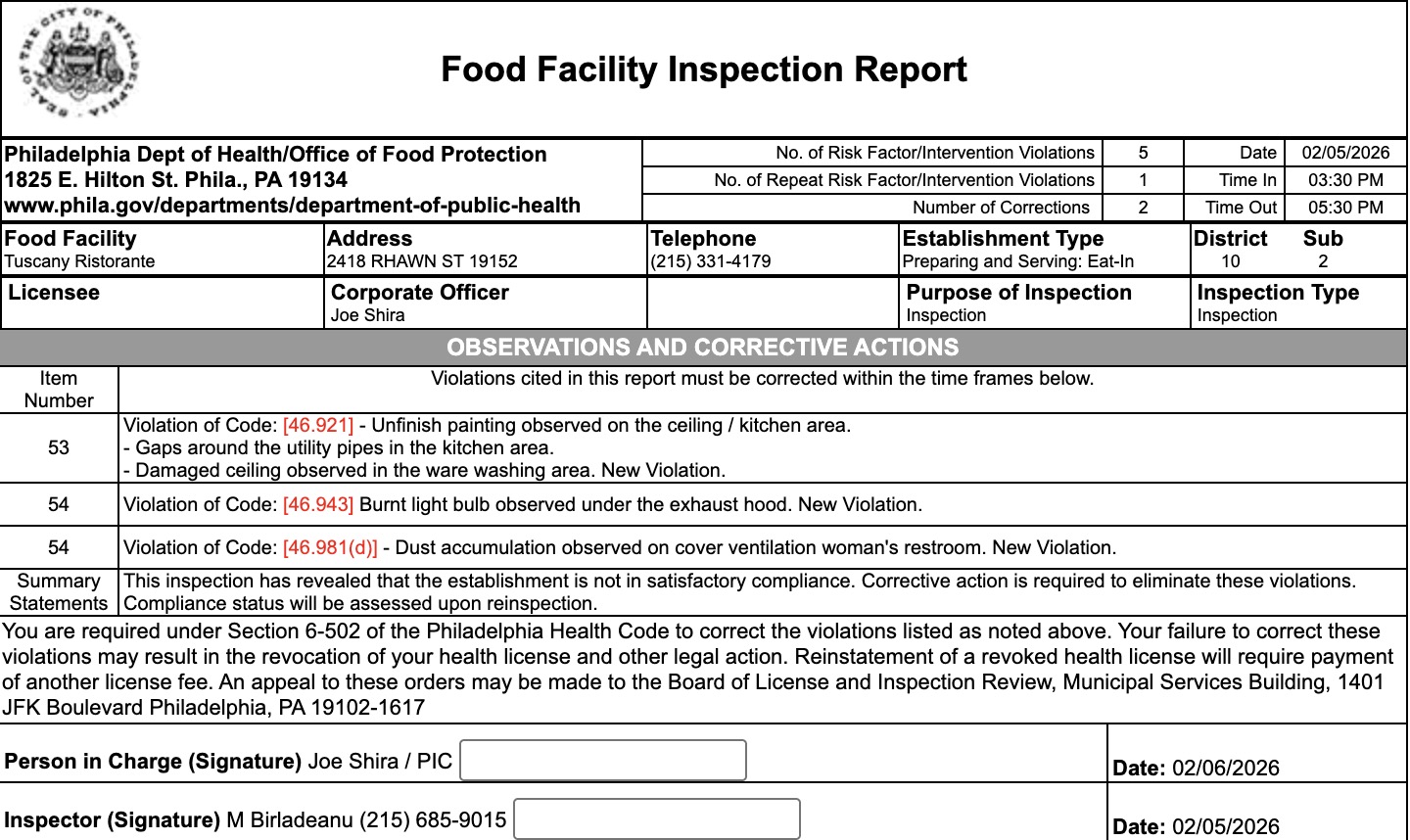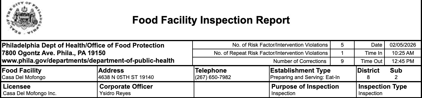 The Philadelphia health department conducted a routine inspection across the area on February 5. The report flagged several health code violations at Casa Del Mofongo, Mom & Daughter’s Soul Food, and Tuscany Ristorante.