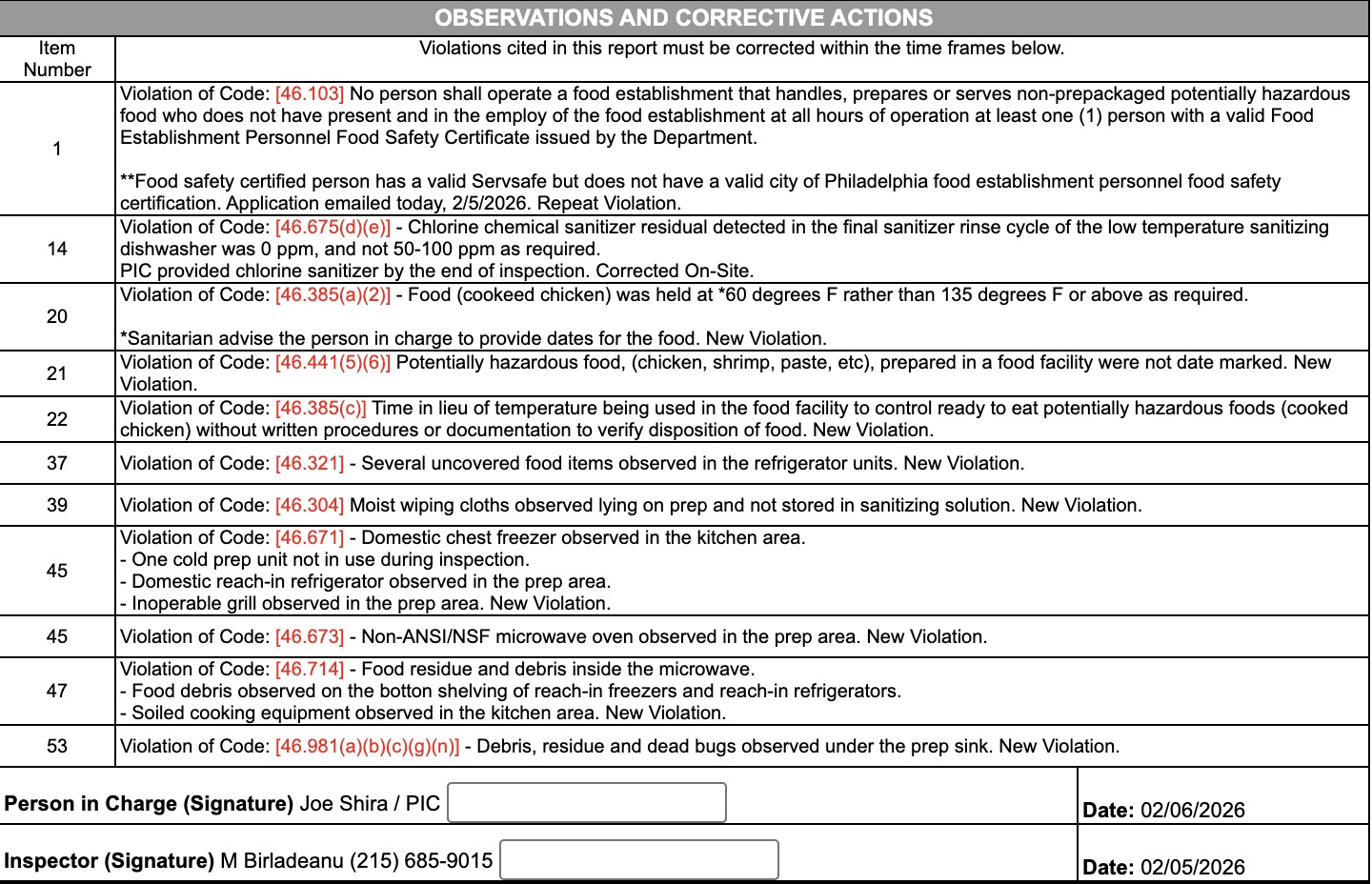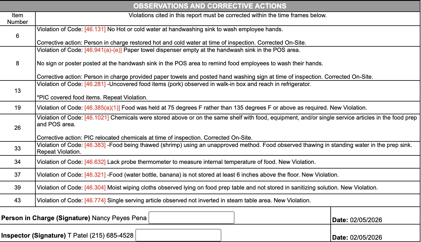 - The food establishment was operating without a city-issued Food Establishment Personnel Food Safety Certificate on site at all hours. An application was emailed on February 5, 2026.