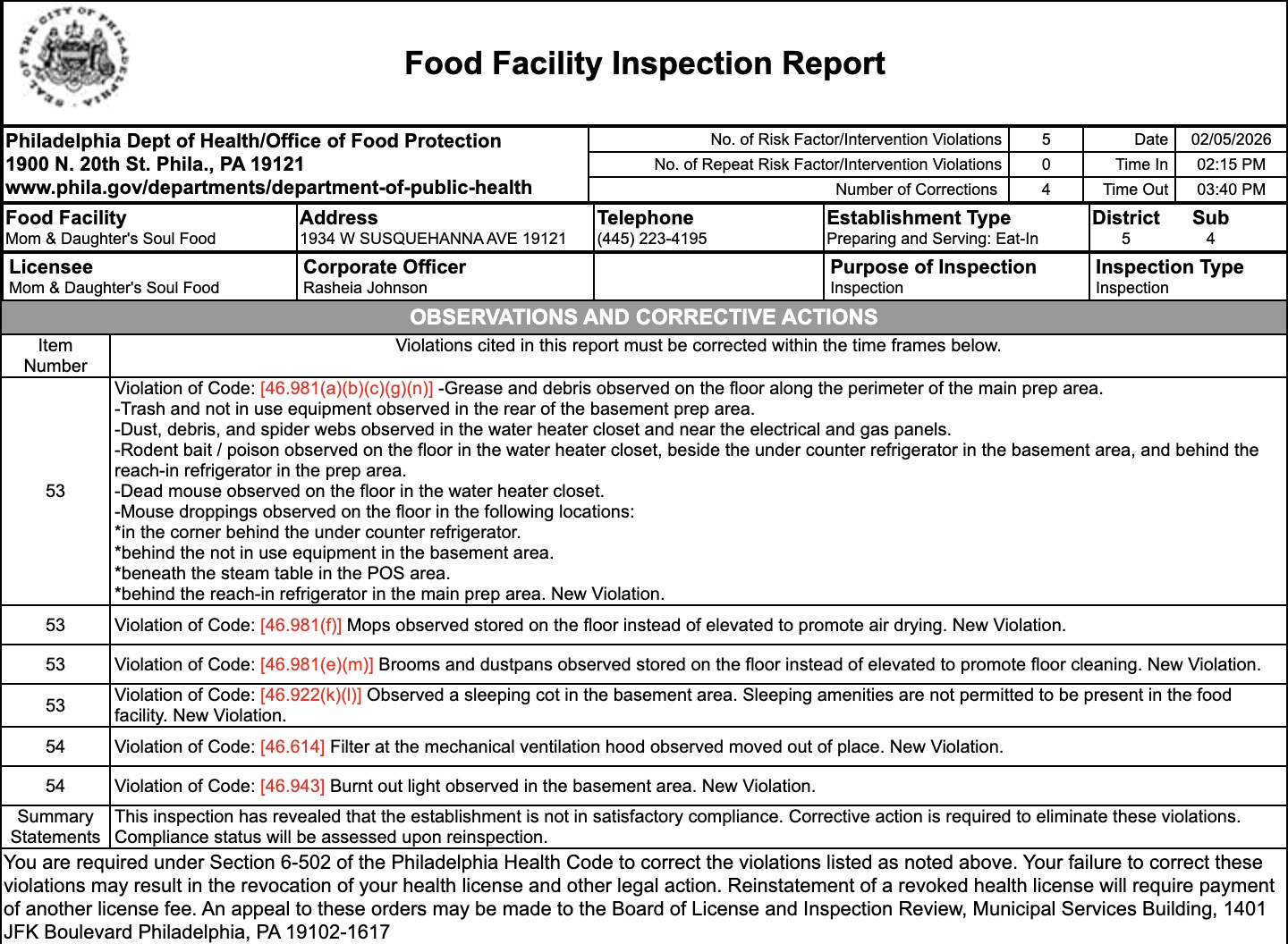 Mom & Daughter’s Soul Food was flagged for many violations. Some of the violations were: