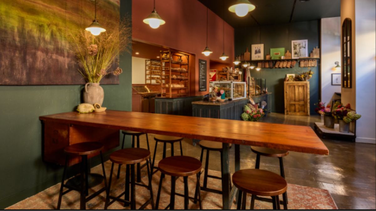 Designed by Meg Rodgers, the 19-seat bakery balances rustic charm with industrial character. The large windows under the 14-foot ceilings bring ample amounts of sunlight, which puts a spotlight on a 6×8-foot abstract painting by Kevin O’Brien Studios. A communal table once owned by Dr. Albert Barnes adds a historic touch, complemented by refurbished benches and a vintage cabinet for a warm, inviting atmosphere.