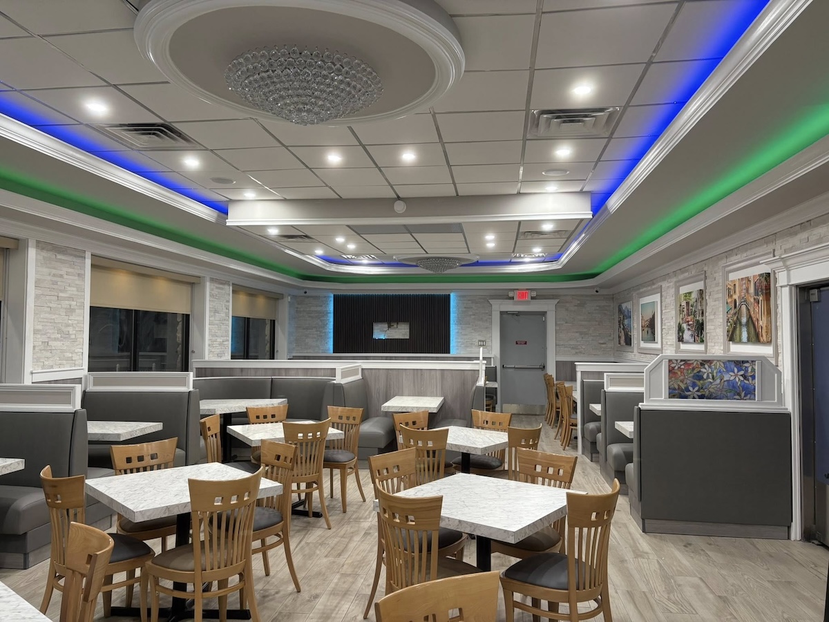 The remodeled dining room features gray upholstered booths and light wood seating set against white marble-patterned tables and plank flooring. The space is highlighted with crystal chandeliers and vibrant blue and green LED accents. Faux-stone walls and framed landscape art finish the interior.