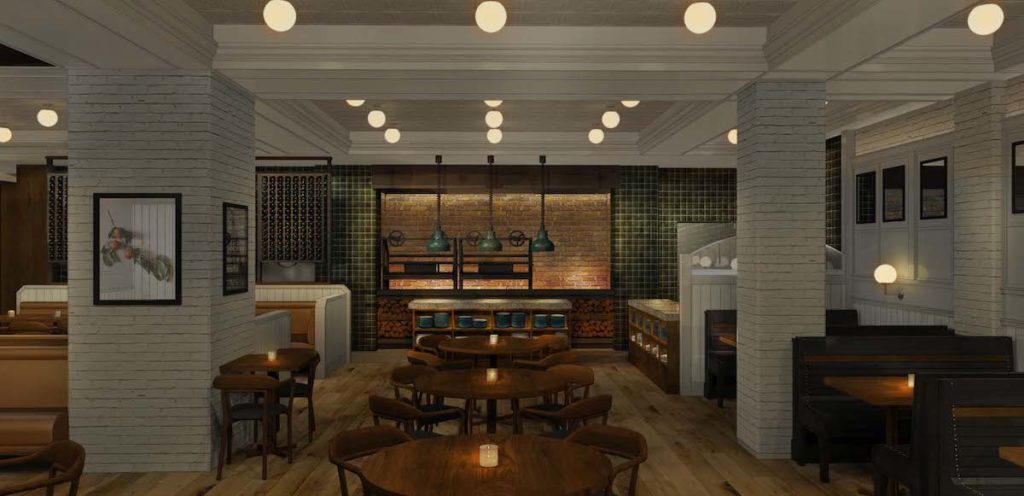The 5,000 sq. ft. steakhouse, designed by Stokes Architecture + Design, will cook its meat in an open-hearth oven, which will serve as a focal point in the 70-seat main dining room along with the restaurant’s fireplace made from steel and emerald-colored tile. The horseshoe-shaped bar will seat another 10, while a four-seasons sunroom space will have seating for 30 and be decorated with porcelain mosaic tile flooring, skylights, and bifold windows. This area will also have a small bar primarily used for service.