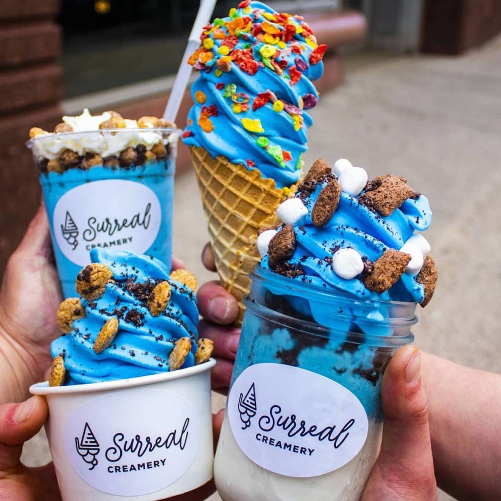 Surreal Creamery also serves bubble teas topped with ice cream, milk teas, jasmine fruit teas, slushes, lattes, and milkshakes. You can often find an array of indulgent baked goods at Surreal Creamery, like doughnuts or crispy rice treats. Surreal Creamery currently lists two New York City locations in Midtown East and Greenwich Village and locations in New Brunswick, NJ, and Bryn Mawr, PA. Their websites states that they are currently seeking franchisees.