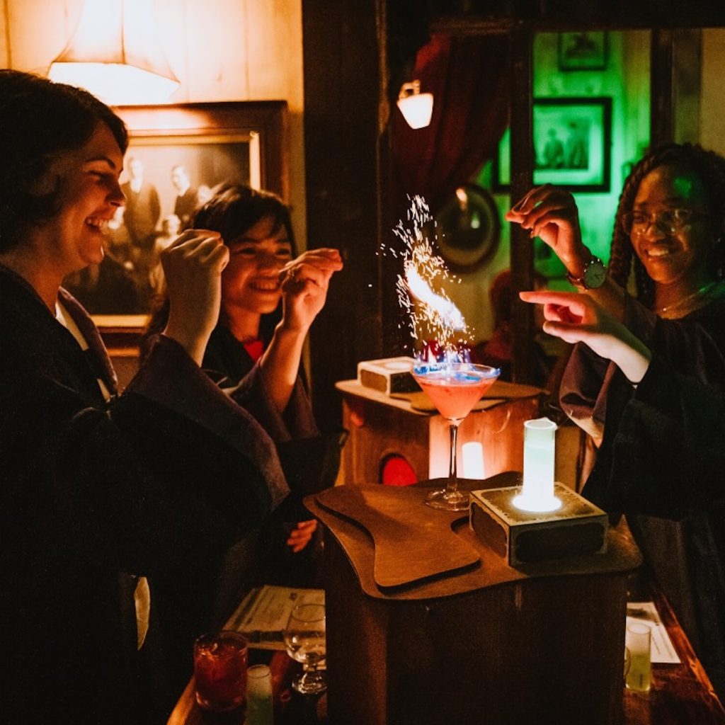 Customers will have the option of buying tickets for an hour and 45-minute potion-making experience that starts a swish and a flick of an electronic sensor magic wand that allows them to have a welcome cocktail poured from the mouth of a mounted unicorn head. After a crash course in Spellcasting 101, customers get to bubble their brews in a cast-iron cauldron using instructions for making two drinks. During the potion-making experience, guests are typically given a wizard robe to wear, though the borrow a robe program is currently suspended due to COVID. Robes are, however, available for purchase. You won’t have to worry about toil or trouble at The Cauldron. There’s a potion’s master on hand to make sure that no one gets poisoned or turned into a toad.