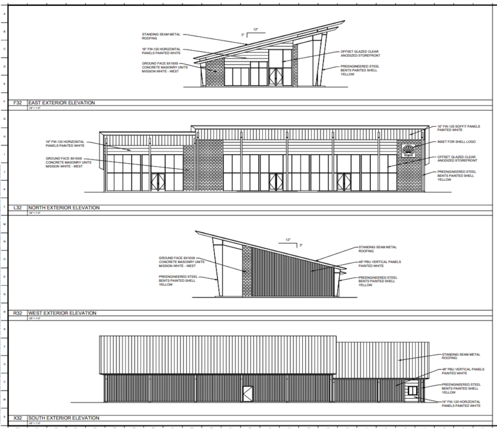The proposed floor plan includes a fuel canopy and a 4,000 square-foot convenience store, complete with restrooms, a beer cave, cooler and freezer, office supply aisle, hot foods section, and a self-service station, with an additional 1,500 square feet reserved for food prep and tables for dining in.