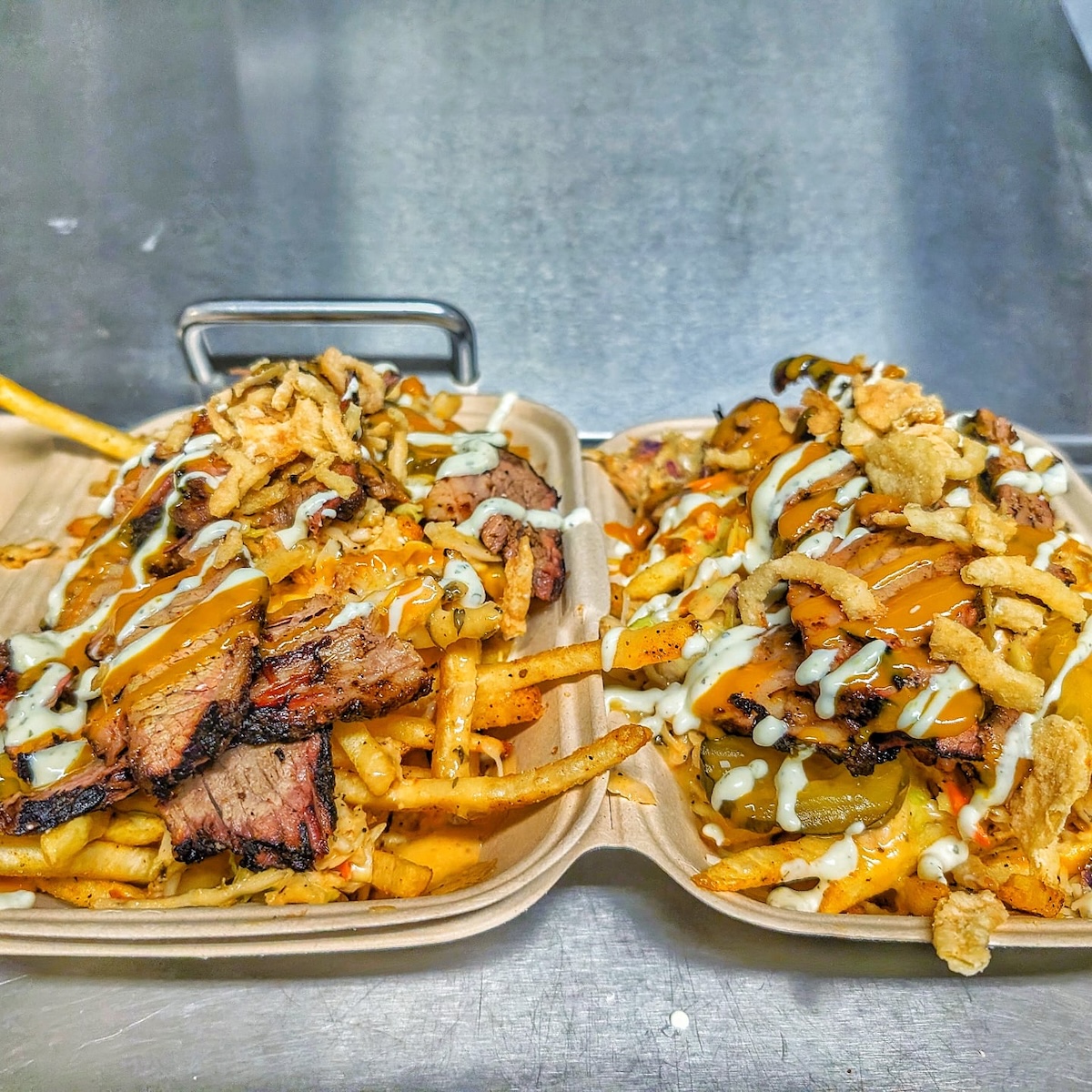 “Crispy Cajun seasoned fries. Slow smoked brisket with that bark. House made slaw. Pickles for the snap. Fried onions for the crunch. Sauce dripping through ever layer.”