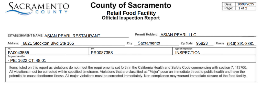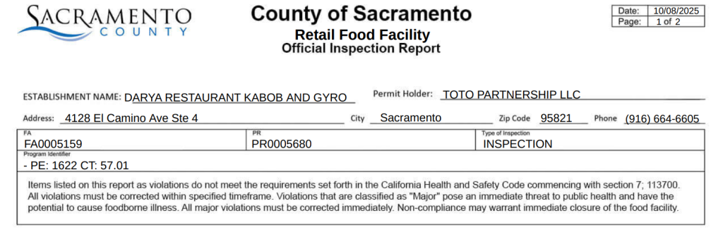 Sacramento County Environmental Management Department conducted a health inspection at various food establishments on October 8. Two restaurants were cited for multiple food safety violations and received a yellow placard, according to the official inspection reports.