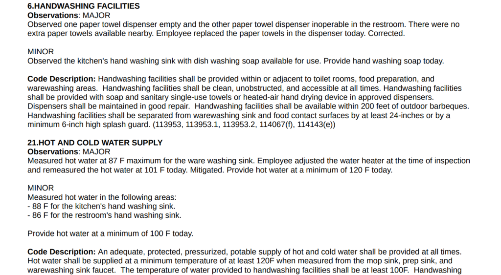 All the major and minor violations, along with code descriptions, are mentioned in detail in the health inspection report.
