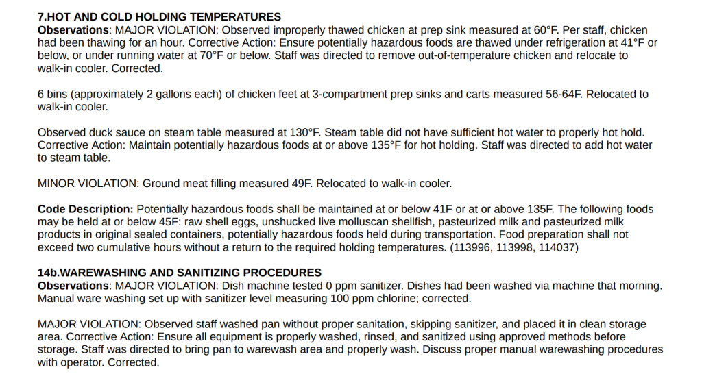 - The report mentions improperly thawed chicken at the prep sink, measured at 60°F. Staff told inspectors the chicken had been thawing for an hour.