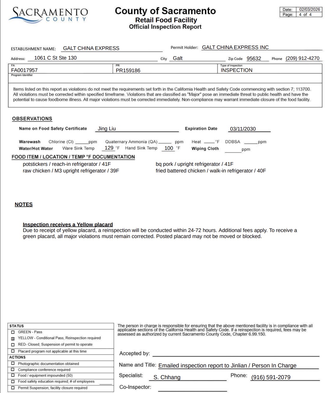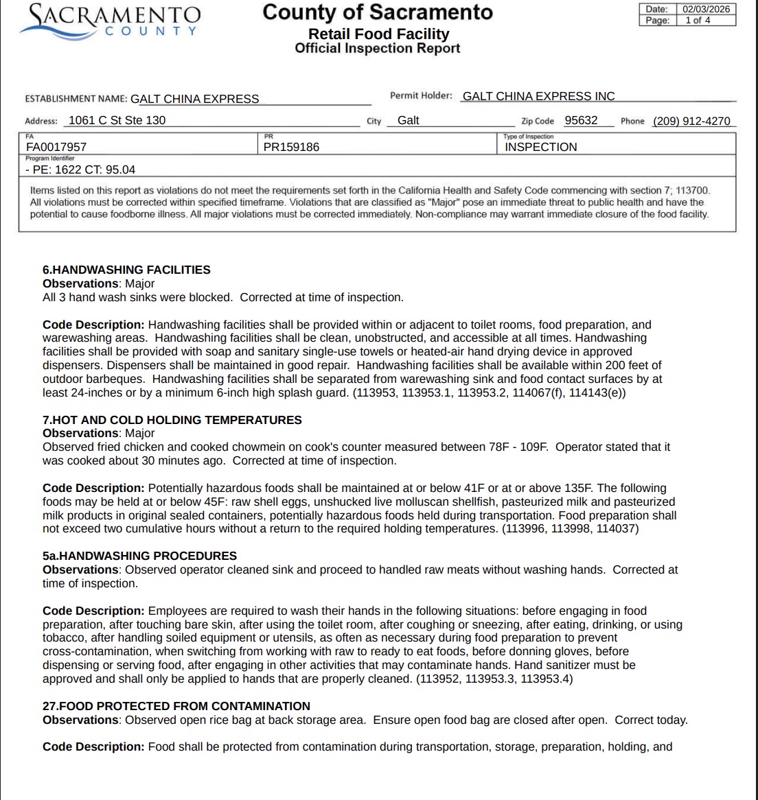 During an inspection on February 3, the Sacramento health department flagged Galt China Express for several health code violations. As a result, the restaurant was issued a yellow placard.