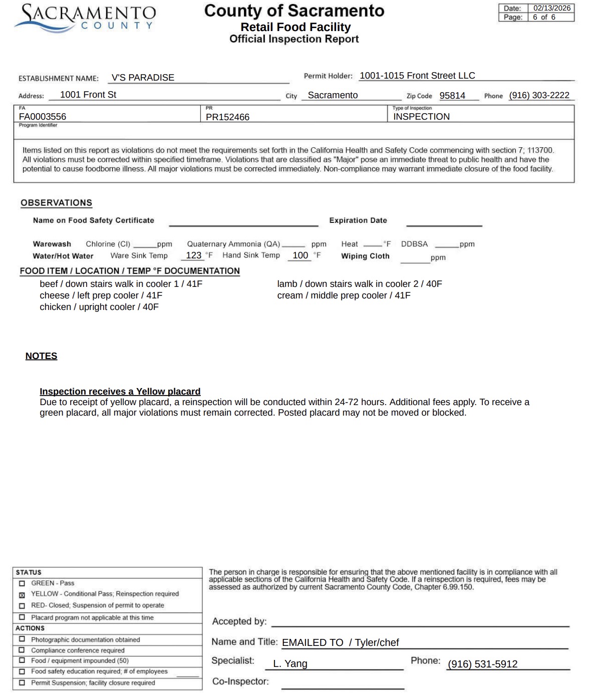 The Sacramento health department carried out a health inspection on February 13 at V’s Paradise. The eatery was found in violation of several food codes and was given a yellow placard during a routine check.