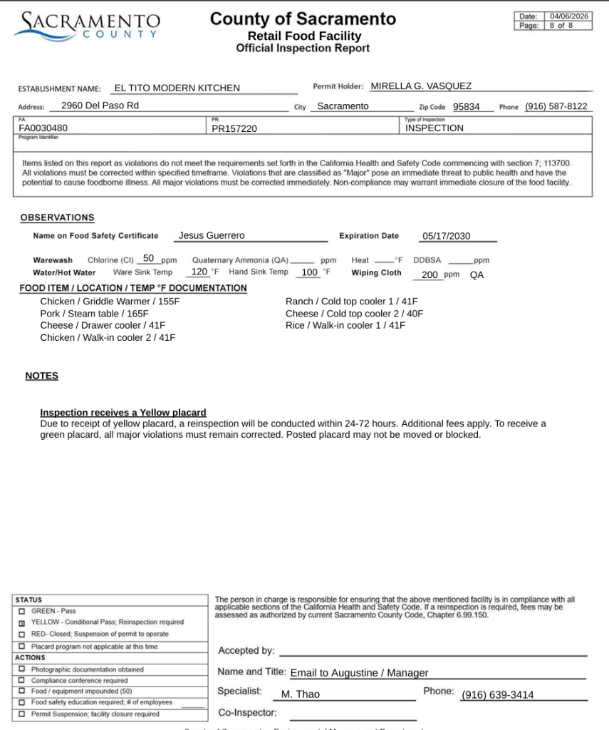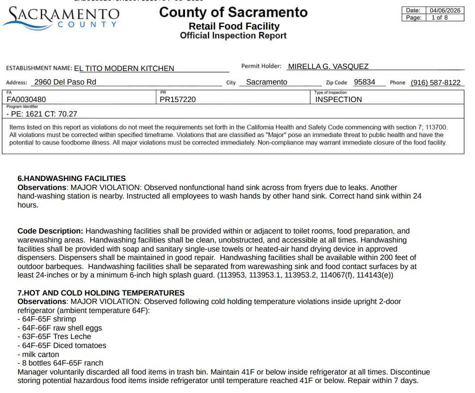 A routine health inspection at El Tito Modern Kitchen in Sacramento on April 6 found several violations during the inspection. The report noted uncovered food containers, leaking pipes, and other cleanliness issues.