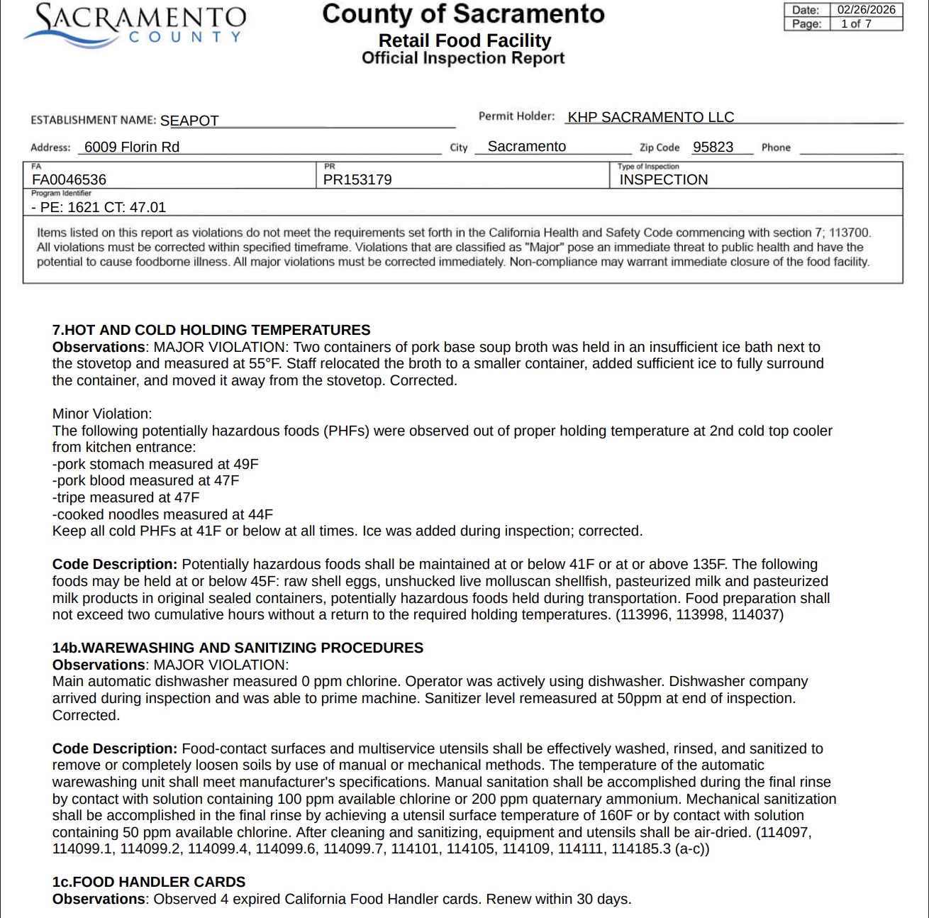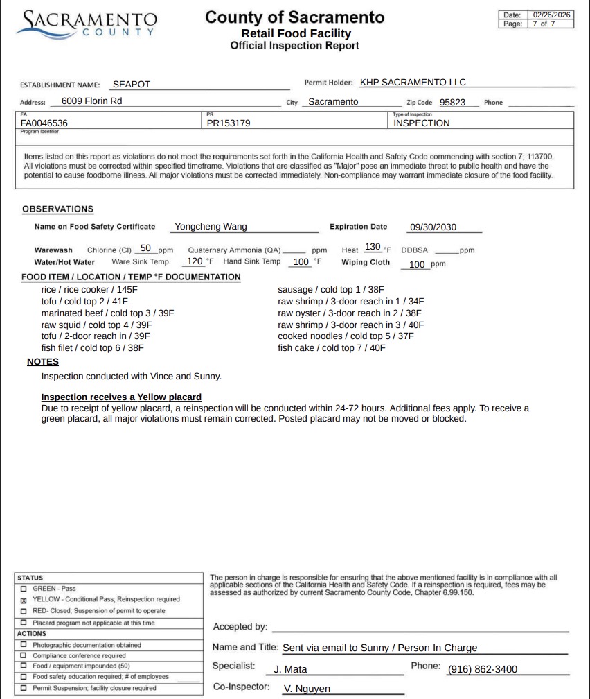 The Sacramento County Department of Environmental Management conducted an inspection at Seapot on February 26 and cited the restaurant for multiple health code violations. The restaurant was issued a yellow placard.