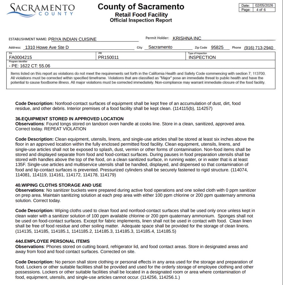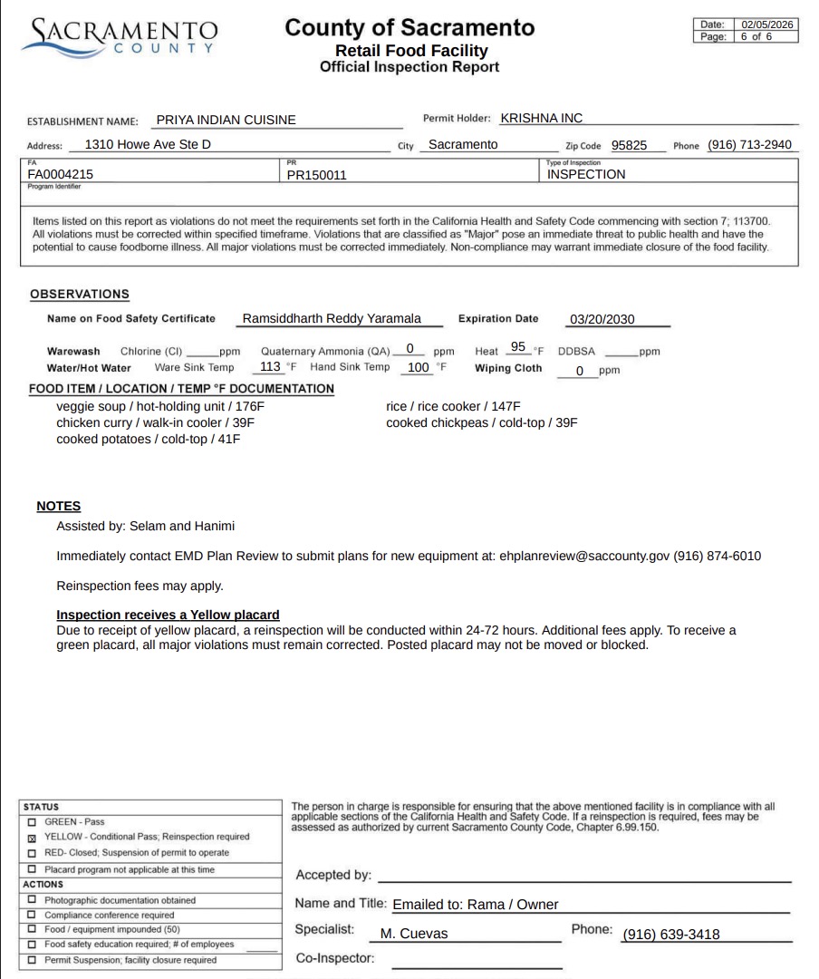 The Sacramento health department held a routine inspection at Priya Indian Cuisine on February 5. The restaurant was found to be non-compliant with food safety codes and received a yellow placard.