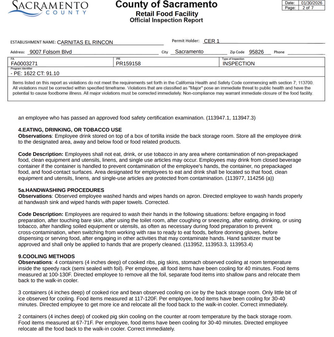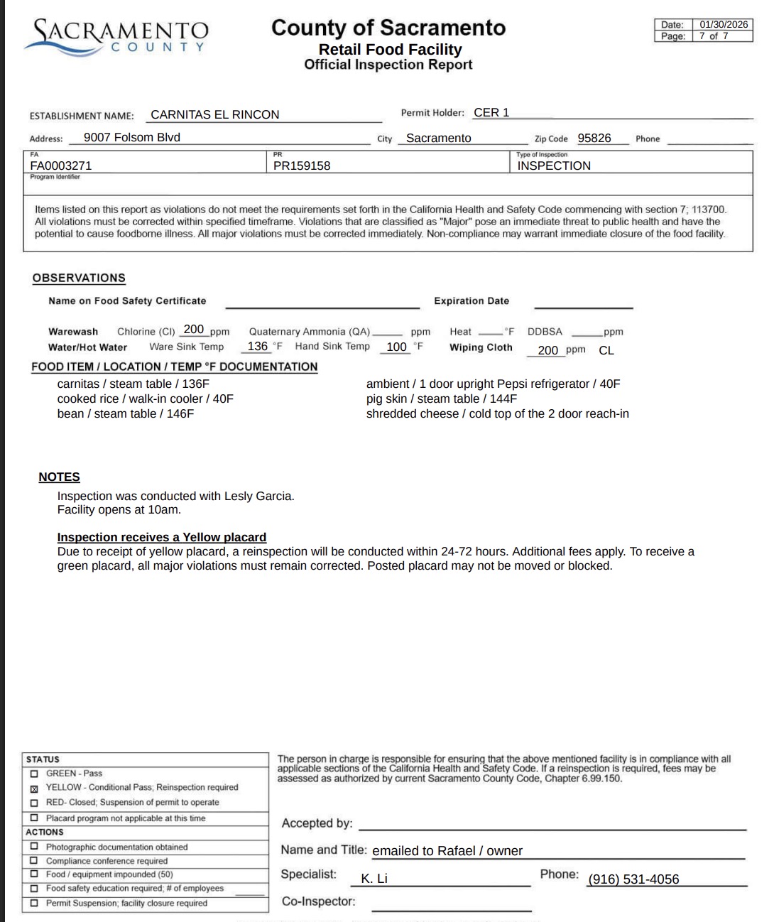 The Sacramento health department carried out a routine check at the Mexican restaurant Carnitas El Rincon on January 30. The restaurant received a yellow placard after being cited for multiple health code violations.