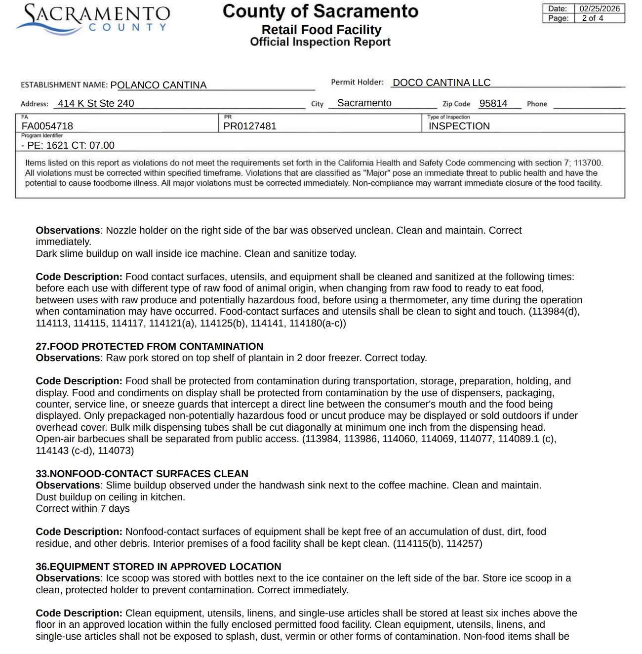 Polanco Cantina serves authentic Mexican cuisine and drinks in downtown Sacramento. According to the report, the violations were: