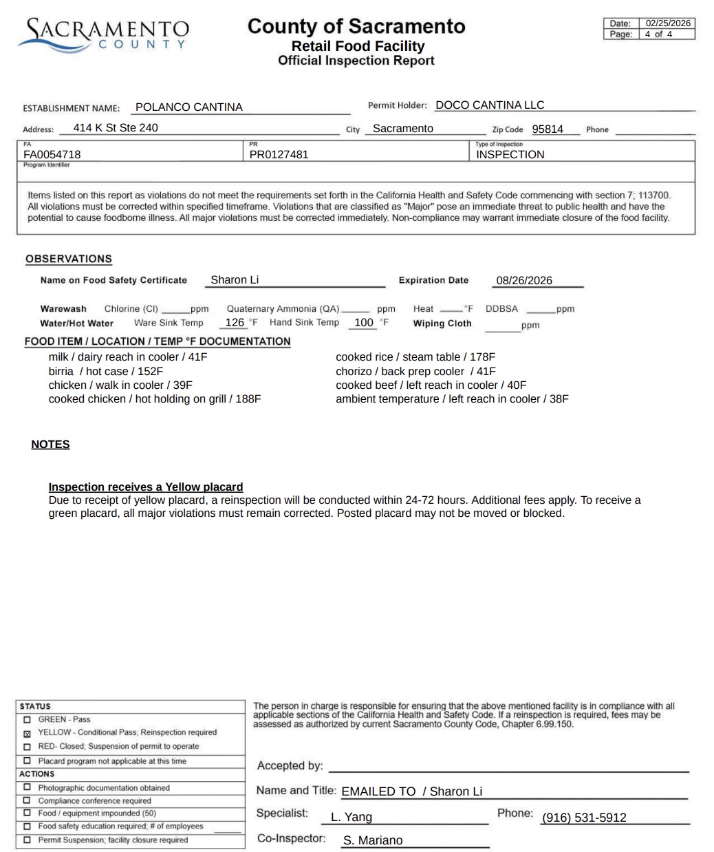 The Sacramento health department carried out a routine check at Polanco Cantina on February 25. The food establishment received a yellow placard after being flagged for many health code violations.