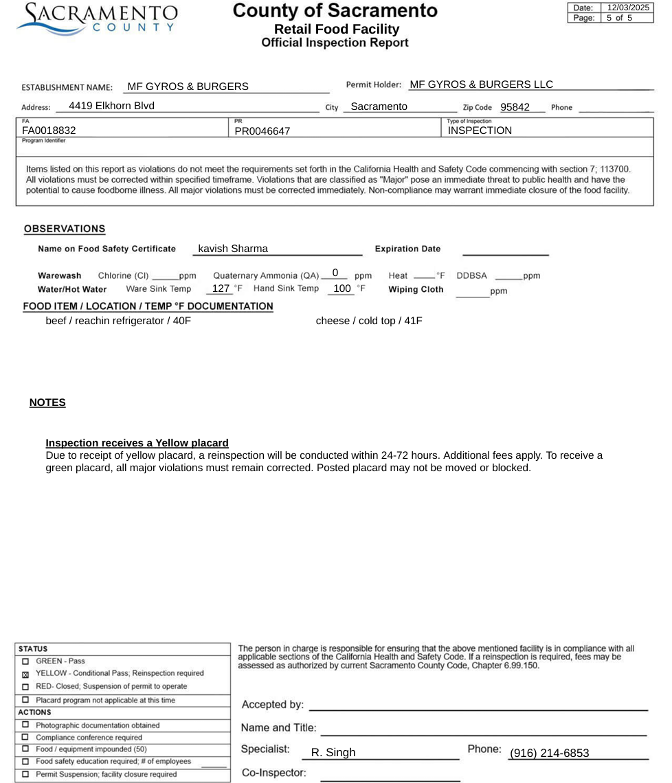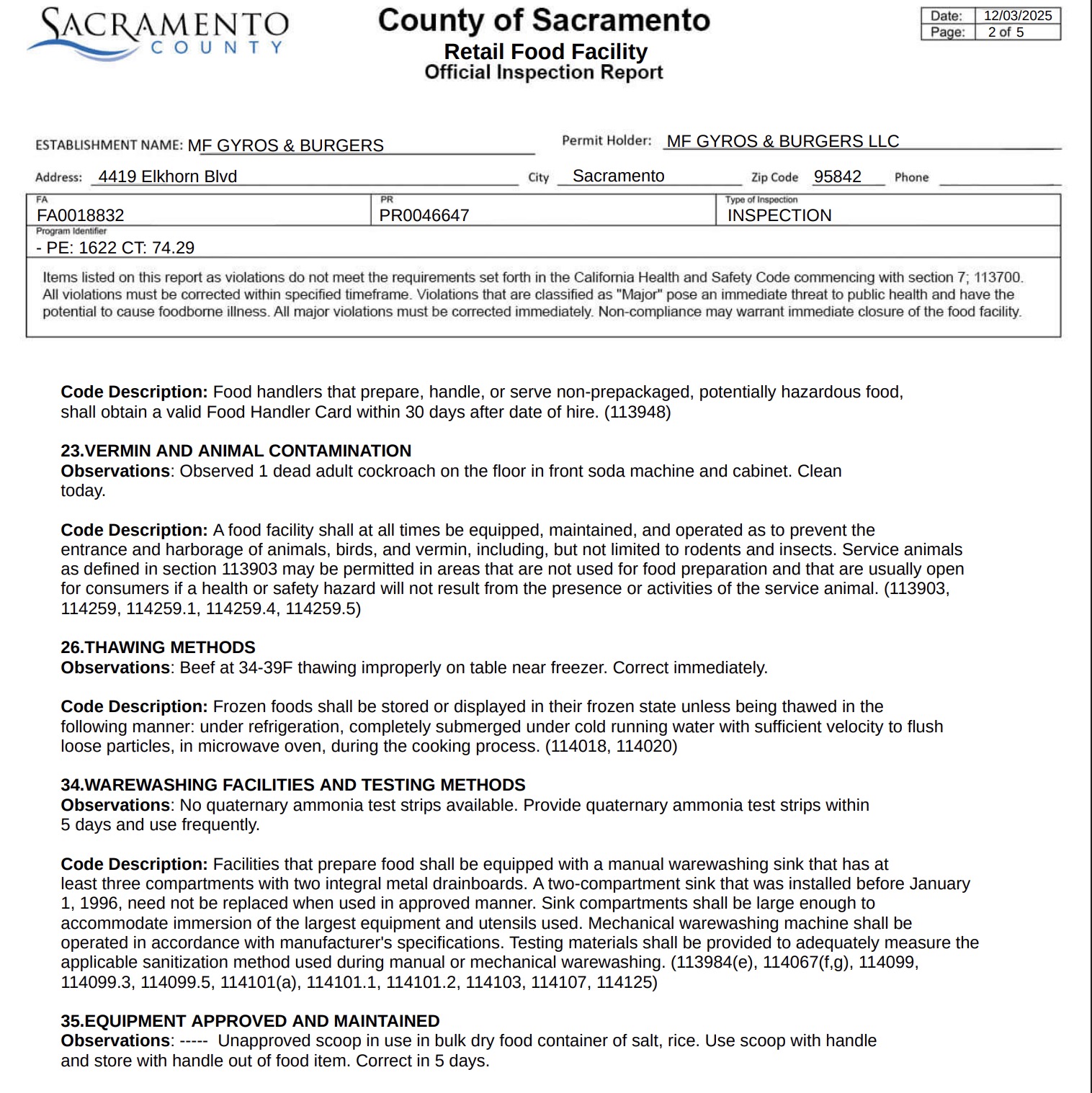 MF Gyros & Burgers underwent a routine inspection on December 3 and was cited for several food safety violations. The restaurant is expected to address the breaches before the reinspection.