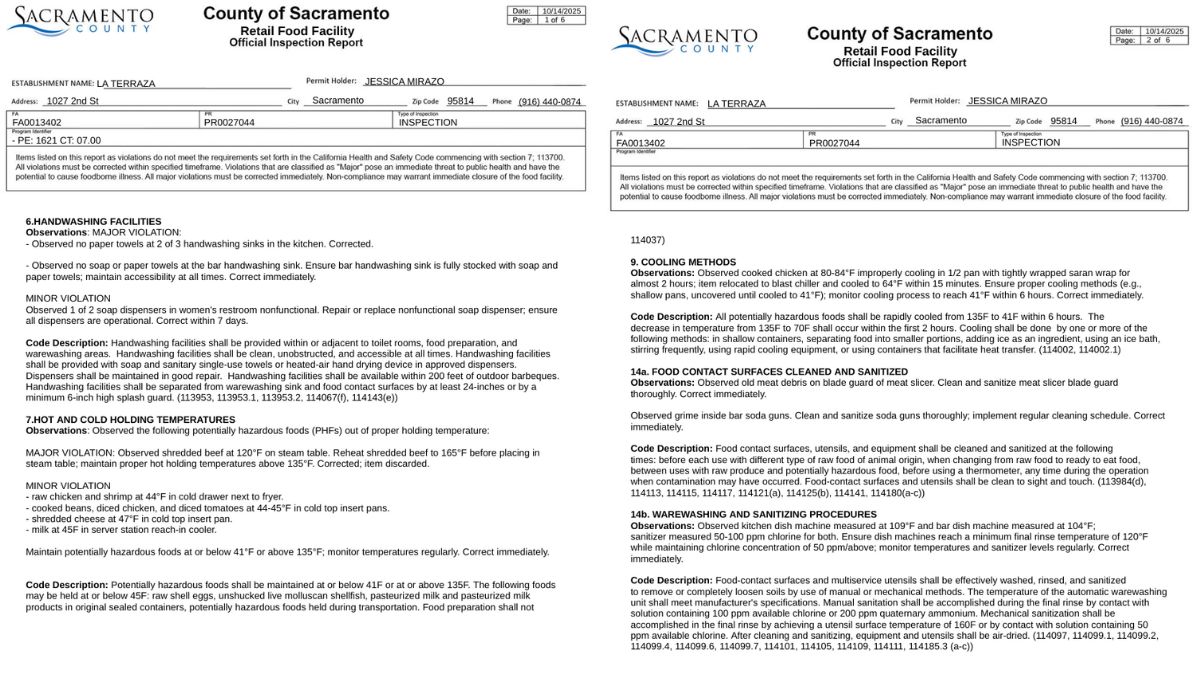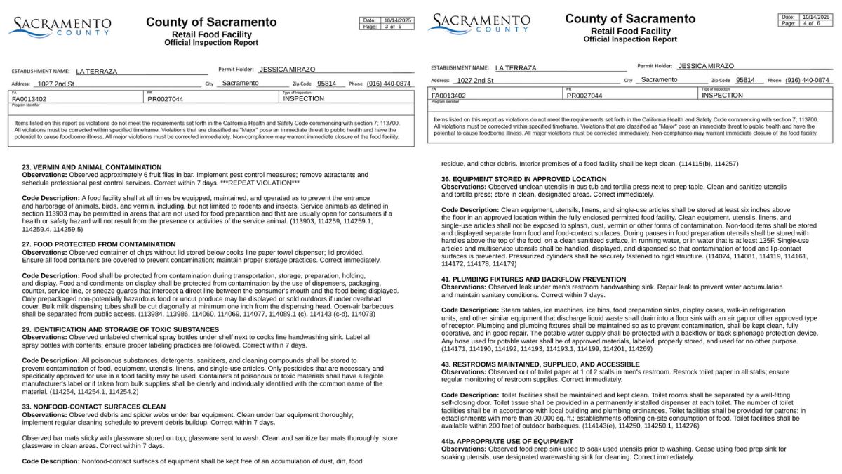 Sacramento County Environmental Management Department conducted a routine inspection at La Terraza on October 14. The restaurant was cited for several violations, including the presence of six fruit flies and improper food holding and cooling temperatures.