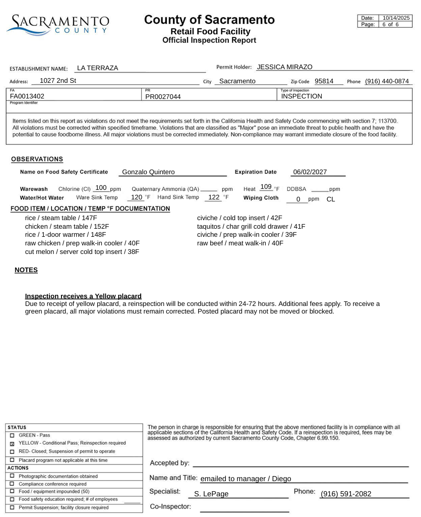 The Sacramento Health Department issued a yellow placard to La Terraza. A reinspection will be conducted within 24 to 72 hours. The restaurant must correct all major violations to qualify for a green status.