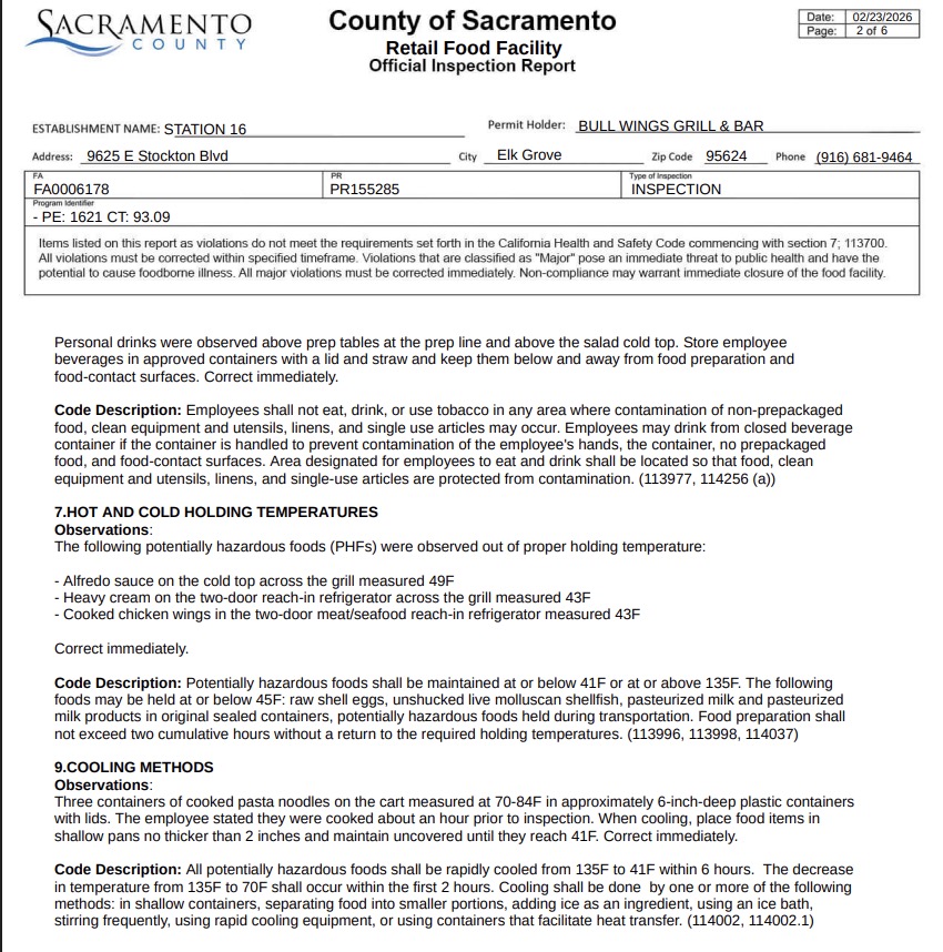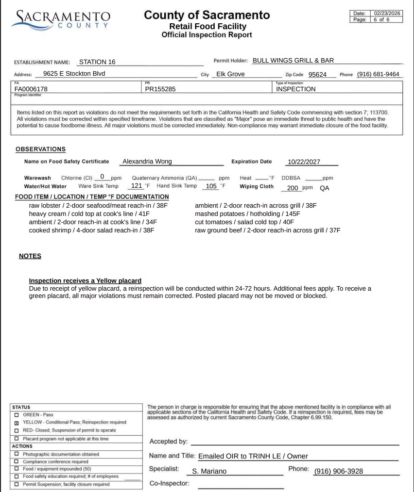 The Sacramento health department conducted a health inspection at Station 16 on February 23. The restaurant was found in violation of several health codes, resulting in it receiving a yellow placard.