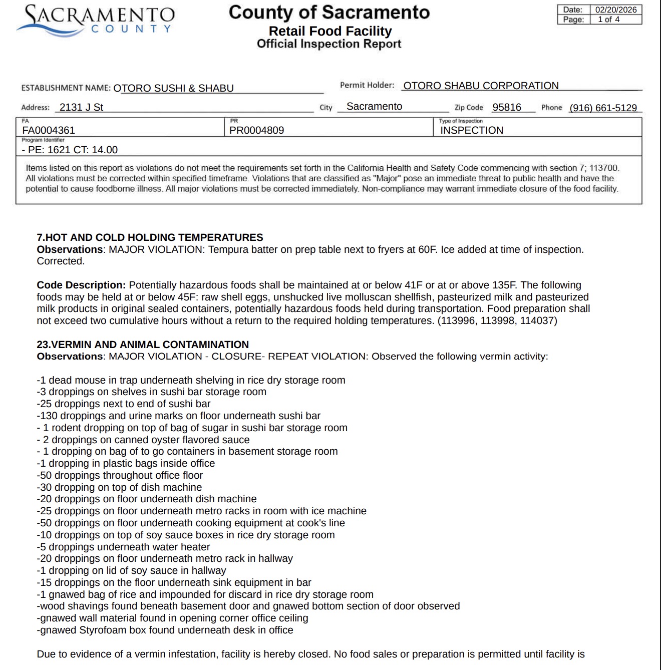 The Sacramento health department found O-Toro Sushi & Shabu to be in violation of several food safety codes. During an inspection on February 20, the restaurant was recommended to shut down.