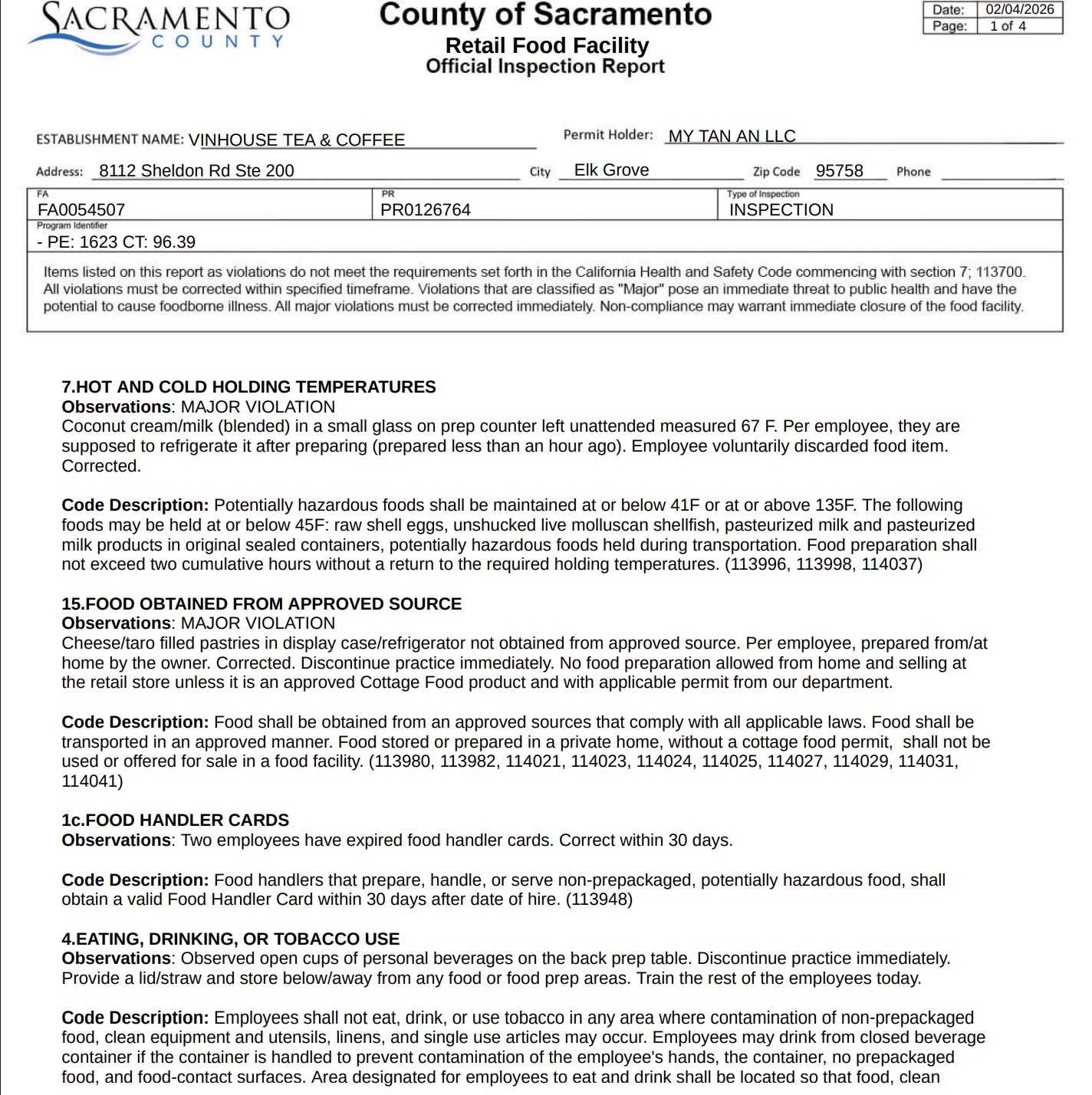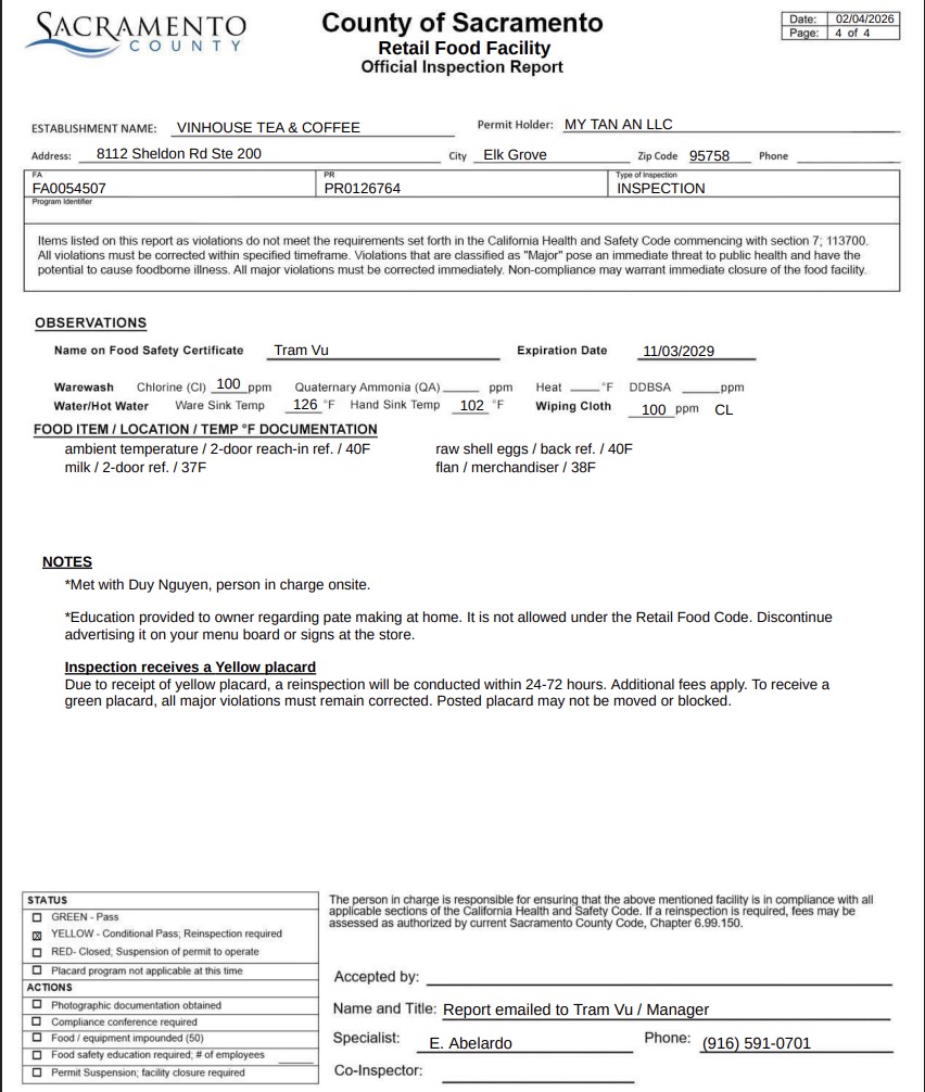 Vinhouse Tea & Coffee underwent a routine check on February 4 by the Sacramento health department. The eatery was issued a yellow placard after being cited for multiple health code violations.
